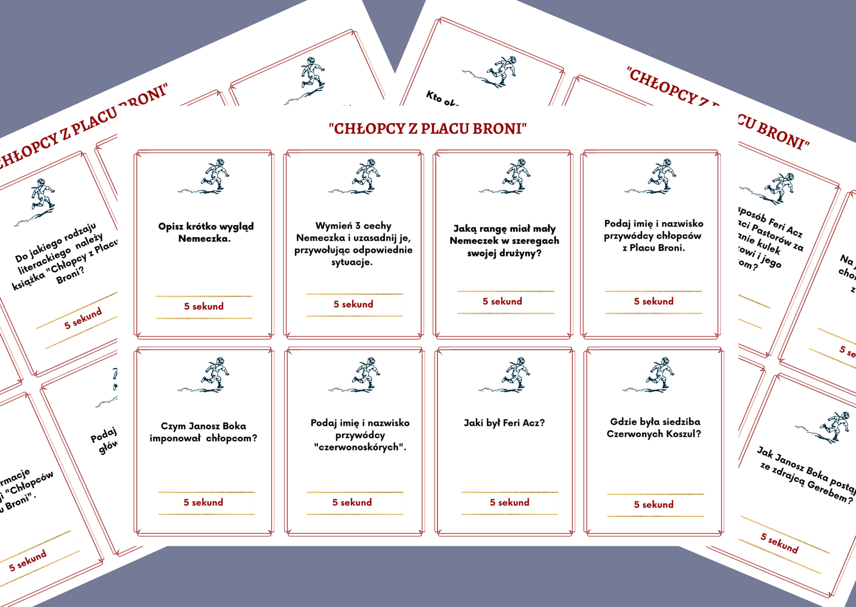 Zestaw 6 kart (format A4 pdf) z 48 karteczkami do gry „5 sekund”, zawierającymi pytania dotyczące treści „Chłopców z Placu Broni".