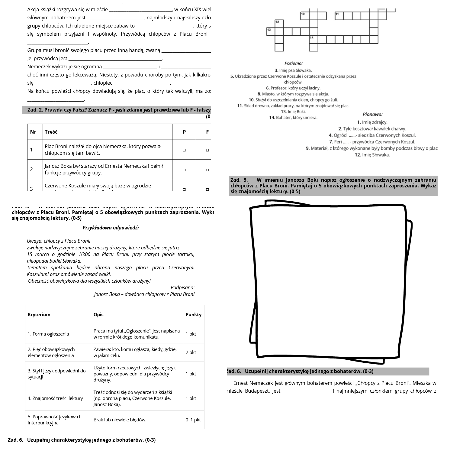 ✅ Sprawdzian podsumowujący – zestaw zadań różnorodnych, sprawdzających nie tylko znajomość fabuły, ale też krzyżówkę, charakterystykę bohaterów, motywy, wartości i przesłanie utworu.
