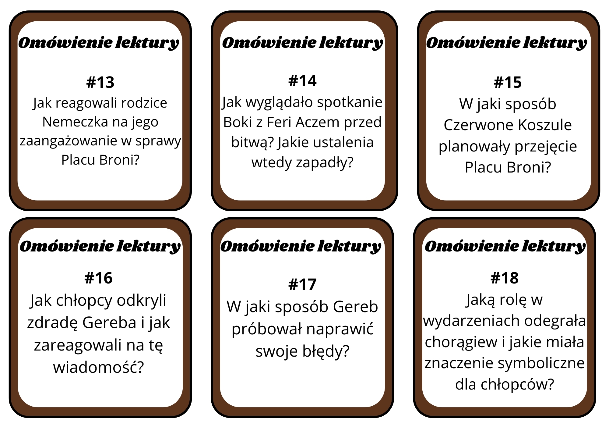 Plik zawiera 30 kart z pytaniami dotyczącymi treści lektury "Chłopcy z Placu Broni". Można je wykorzystać jako podsumowanie lekcji, jak również rozgrzewkę przed lekcją utrwalającą materiał.