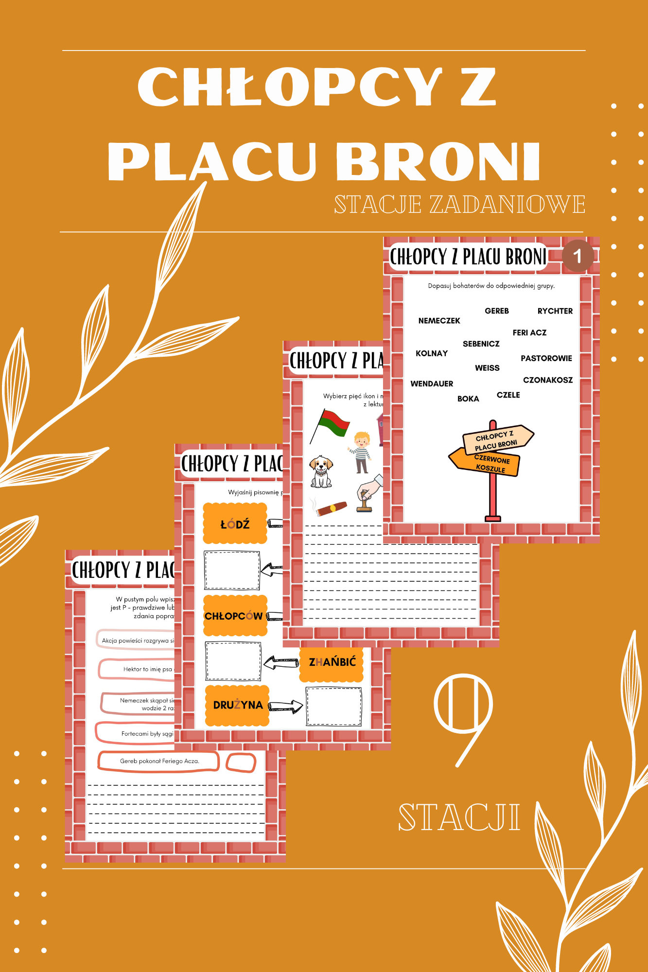 Zestaw zawiera dziewięć kart z różnymi stacjami zadaniowymi z lektury „Chłopcy z Placu Broni”.