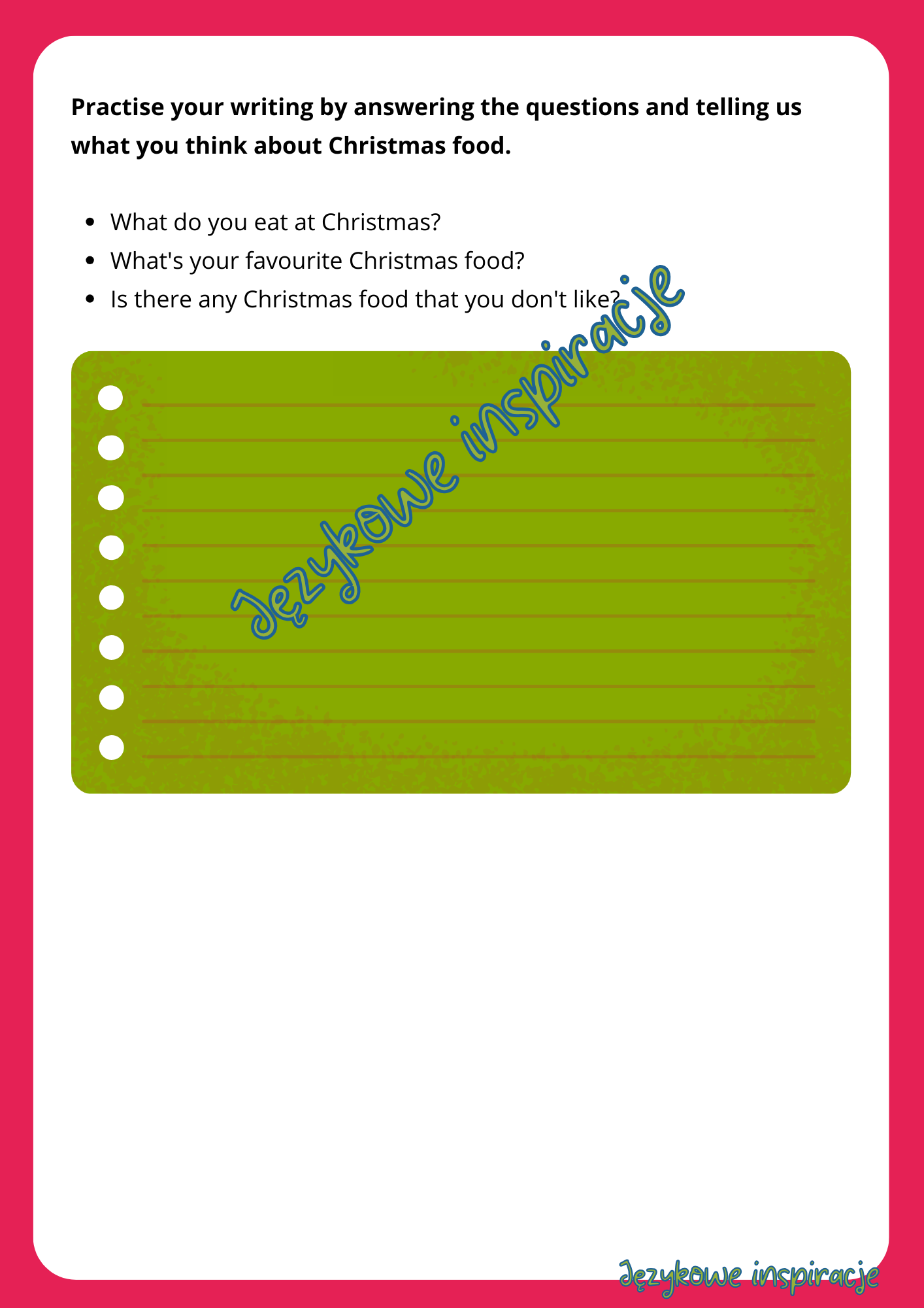 Lekcja 1 poziom A1 - Topic: Christmas If I was an elf... Christmas Vocabulary for Beginners (A1 Level) Color the Christmas trees needed to form the word Chrıstmas odd one out Write the words under the pictures. Fill in the blanks Reading: Timmy's Christmas Wish" Comprehension Exercise Practise your writing: Christmas food Color by Number Lekcja 2 - A2 Topic: Christmas and Winter Reading: "Emily's Christmas Cake" Comprehension Exercise Describe the pictures Christmas Story Writing Example: My Ideal Christmas Day Winter Clothes: Match the words with the pictures. Winter Clothes: Word Search Winter Clothes: tłumaczenie Flashcards Some engaging exercise ideas for A2 level Winter Bingo Winter Weather Descriptions Winter Weather Descriptions (po polsku) Recipe: Easy Vegetable Soup Lekcja 3 - B1 Topic: Winter Winter Debate Winter Idioms Winter Idioms: Fill in the Gaps Winter Story Continuation Winter Survival Guide Project GRAMMAR: Comparatives and Superlatives Translate Polish Sentences into English DESCRIBE THE PICTURE:Practice descriptive language skills by describing a picture with a winter scene. Useful Vocabulary and Expressions for Describing a Winter Scene Lekcja 4 - B2. Topic: Winter Winter in Different Cultures Questions before reading Reading: Winter in Different CulturesWinter in Different Cultures QUIZ Writing: "My Ideal Winter Day" Finish the Sentences - 'My Ideal Way to Spend a Winter Day' Grammar: Giving Advice, Asking for Advice, Expressing Prohibition and Command in a Winter Context Winter Vocabulary/Idioms Describe the picture: How to Describe a Picture on B2 Level of English (Topic: Winter)