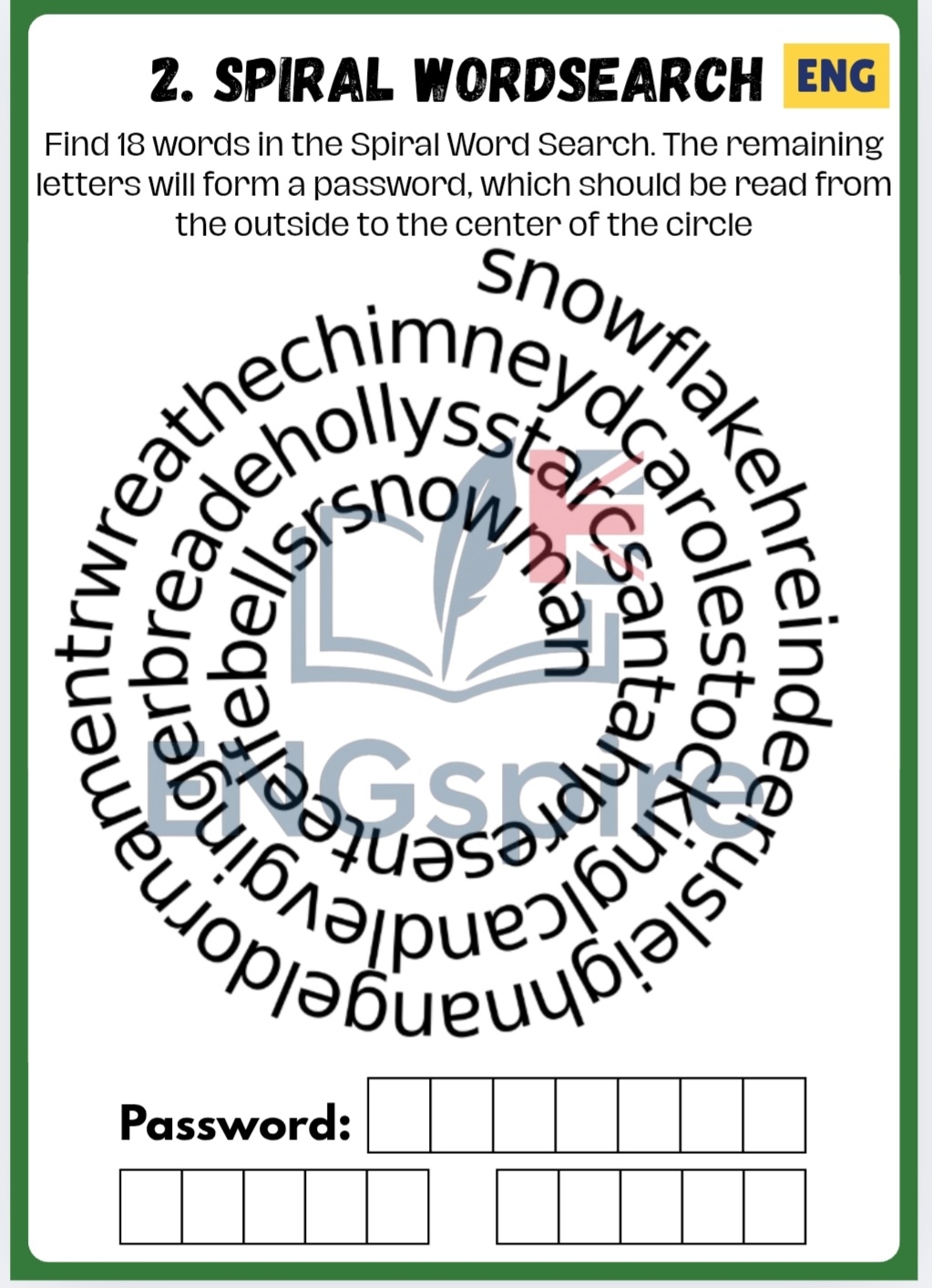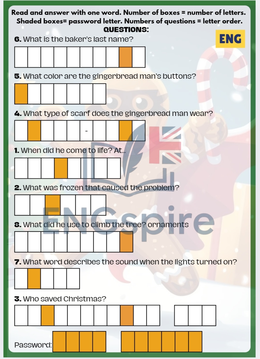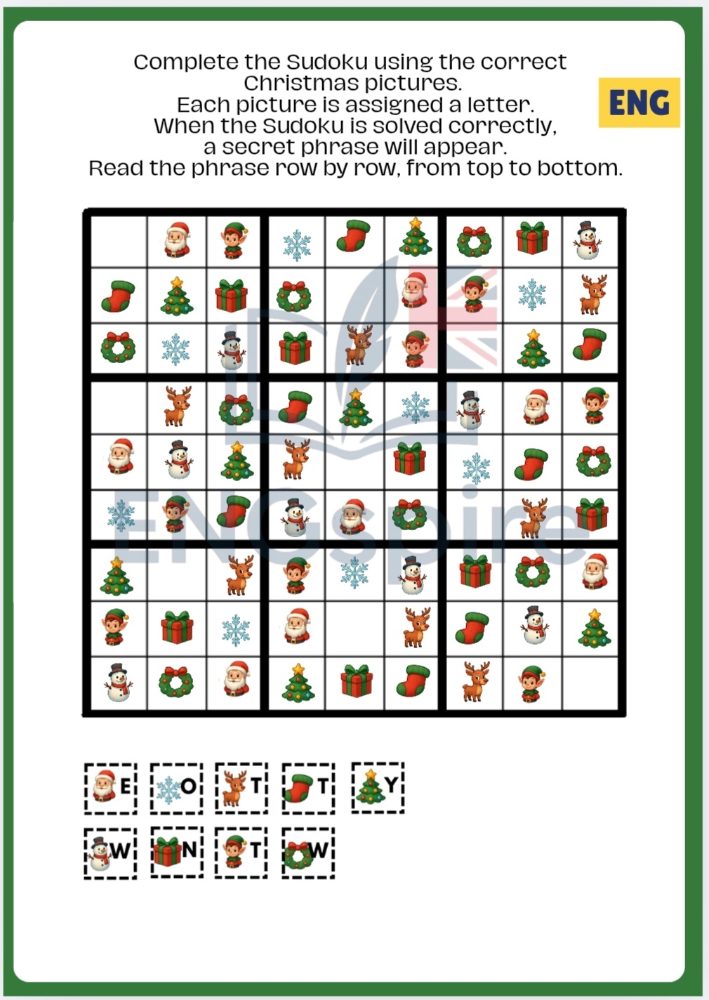 krzyżówka, wykreślanka, czytanie ze zrozumieniem, kolorowy quiz gramatyczny z czasownikami „be”, „have got” oraz czasami Present Simple / Present Continuous, reakcje językowe oraz świąteczne sudoku