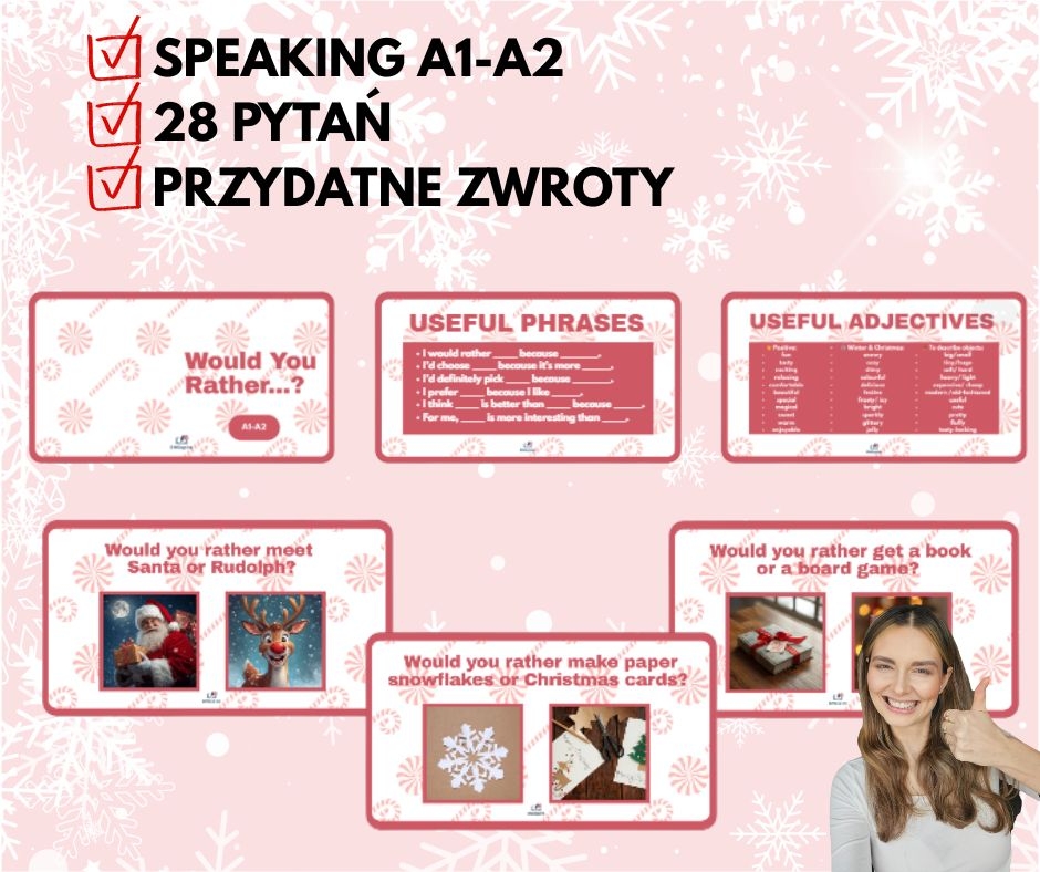 Przygotowałam superświąteczny zestaw speaking cards na poziom A1–A2 – idealny na luźne, konwersacyjne zajęcia, zarówno w klasie, jak i na lekcjach online.