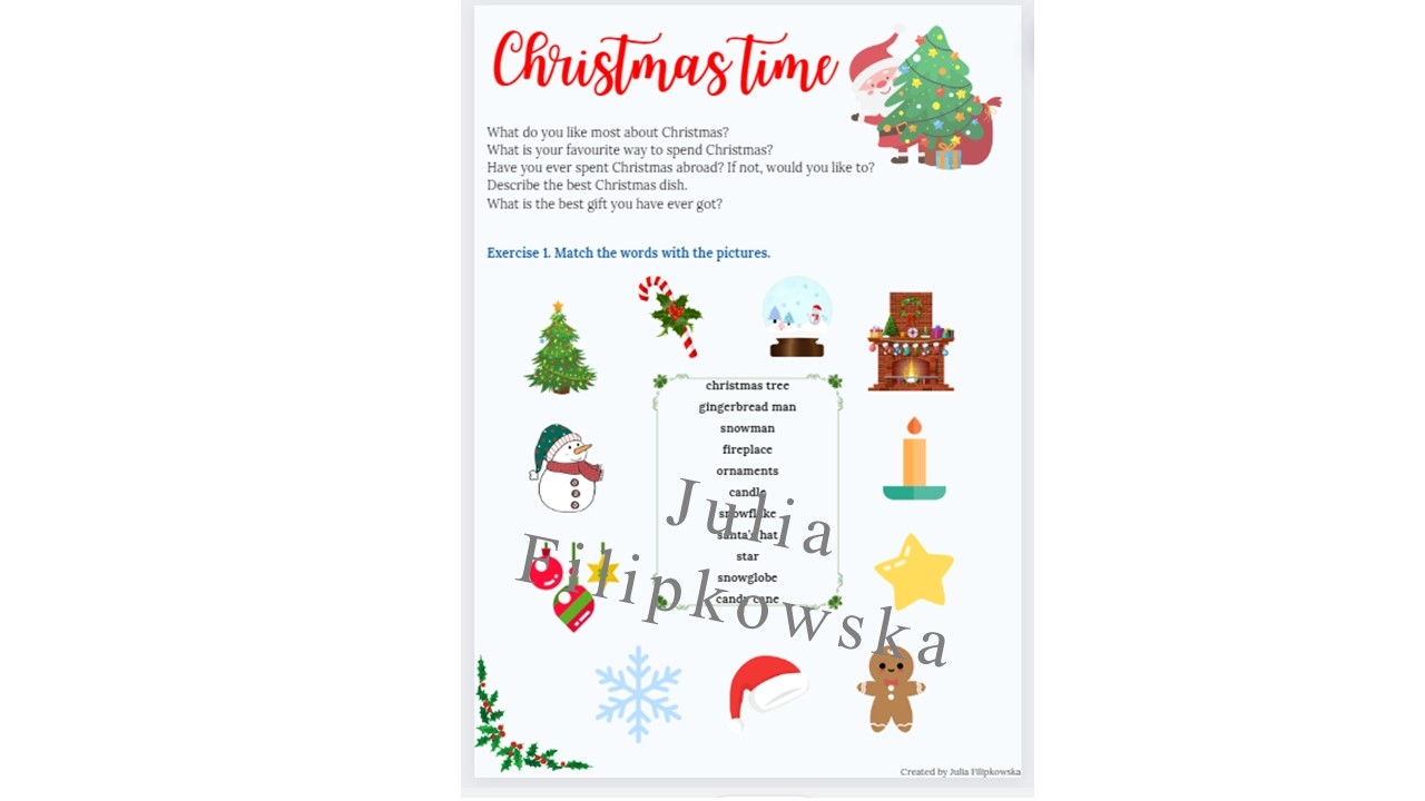 Zapraszam do zakupu materiału w języku angielskim: 3 strony A4, a w nich zadania na mówienie, słownictwo, rozsypanki wyrazowe, rysowanie o tematyce świątecznej.