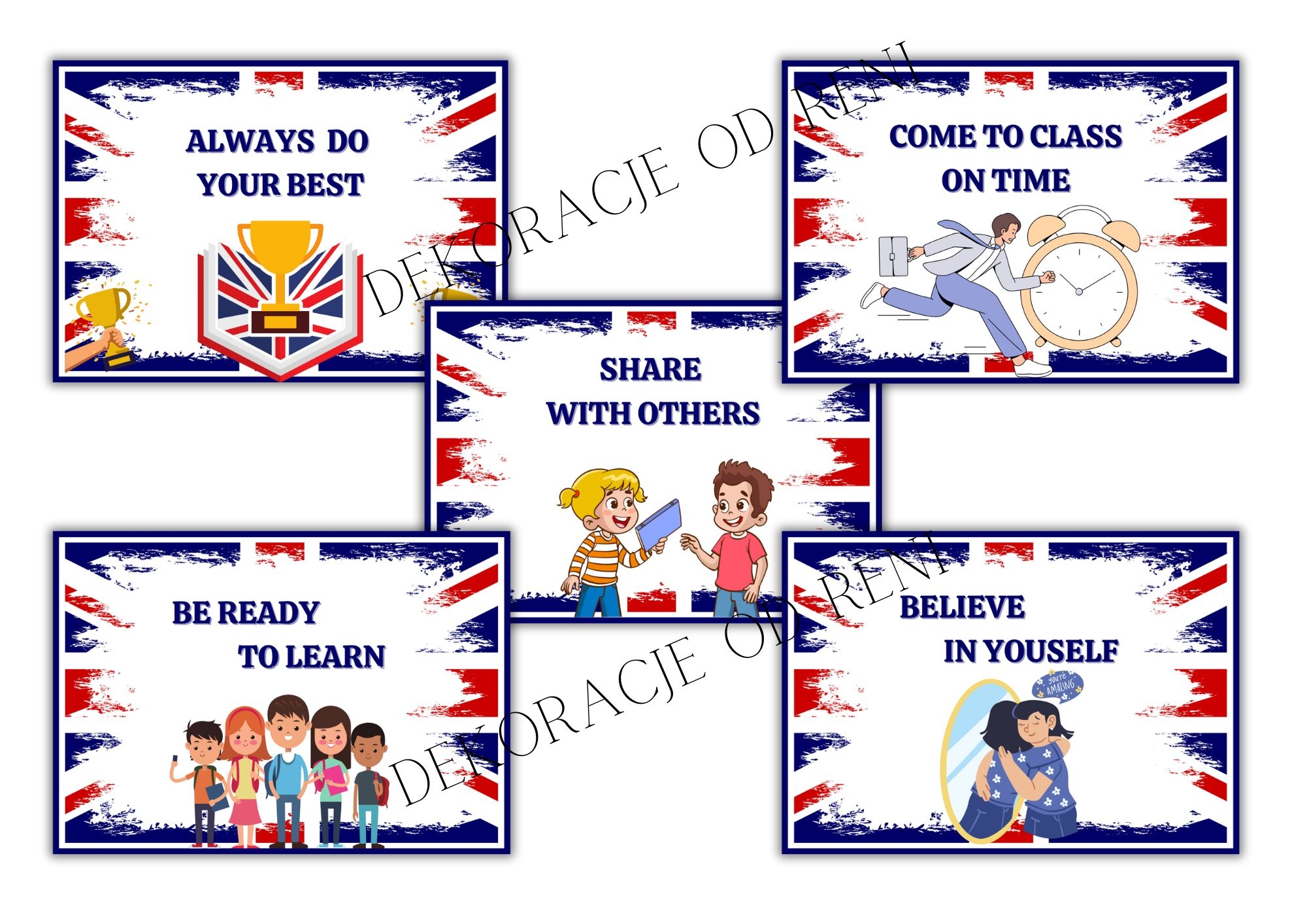 CLASSROOM RULES to materiał na gazetkę w języku angielskim przedstawiony na 21 kartkach A4. Materiał dotyczy zasad obowiązujących na zajęciach języka angielskiego.