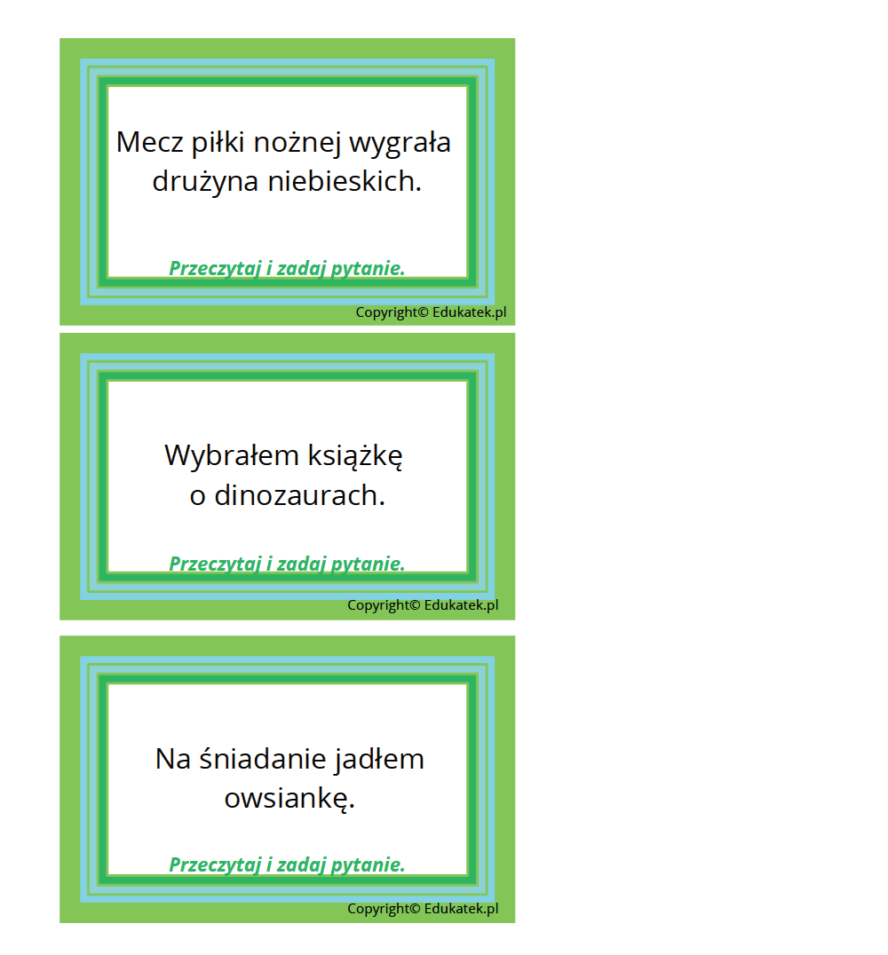 Uczniowie otrzymują/losują wybrane zdania do przeczytania. Dzieci na przemian losują pytanie i udzielają odpowiedzi na nie. Uczniowie starają się odpowiedzieć pełnym zdaniem, odnosząc się bezpośrednio do treści tekstu. Można wprowadzić element punktacji.