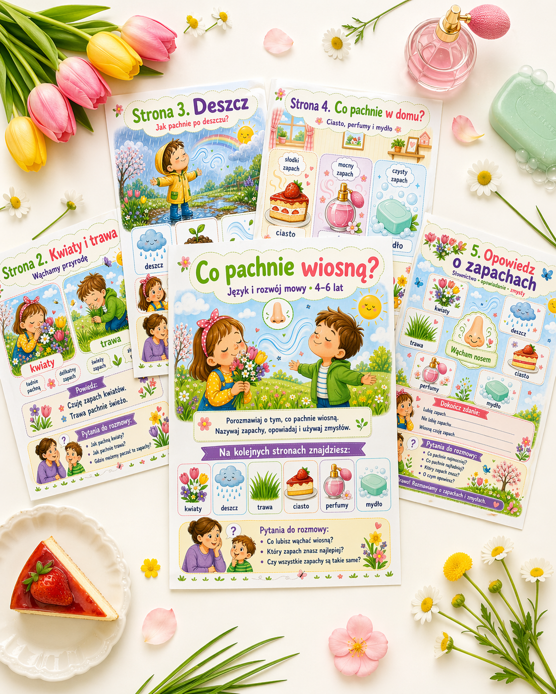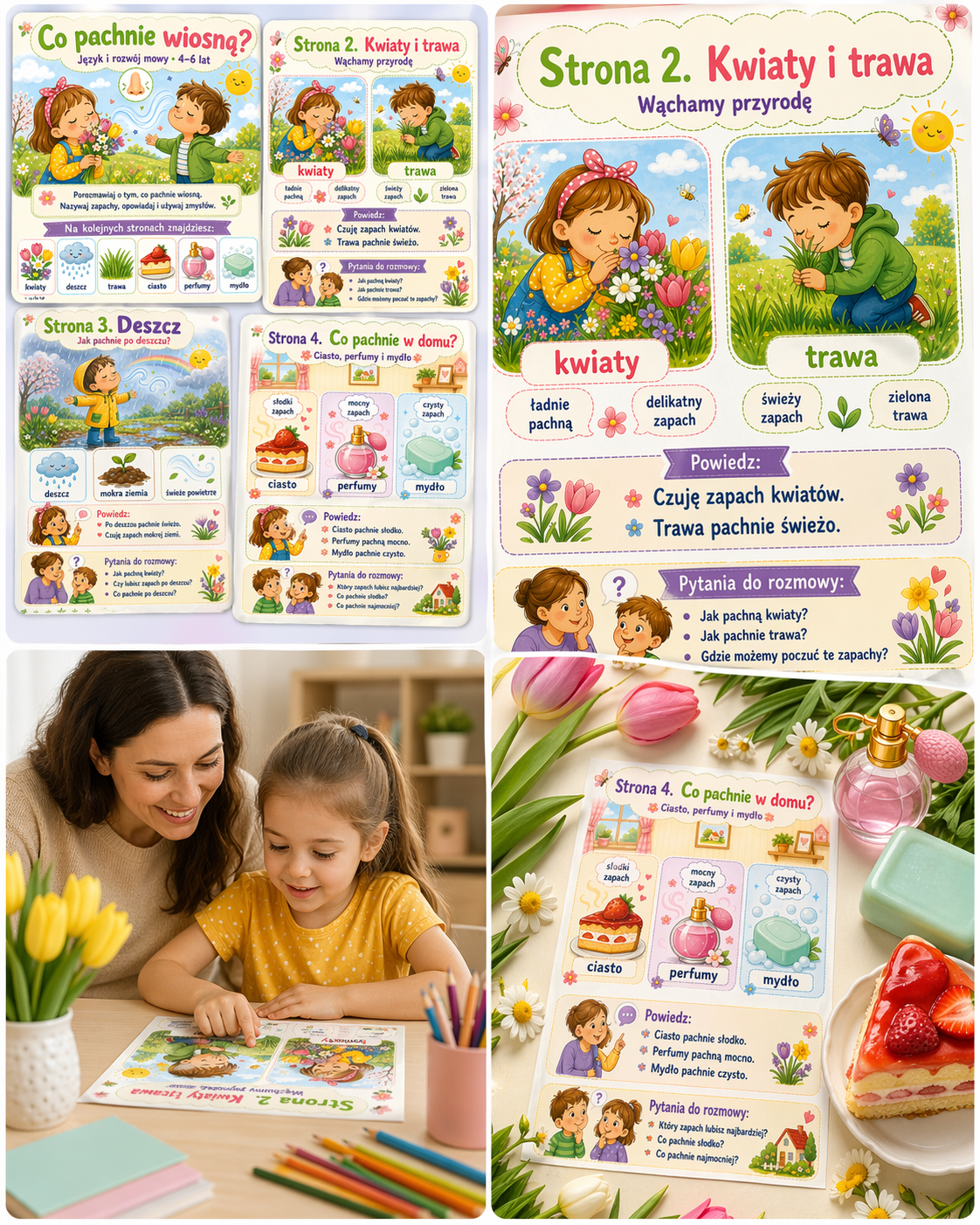 To 5-stronicowa pomoc edukacyjna dla dzieci w wieku 4–6 lat, która wspiera rozwój mowy, słownictwa i opowiadania poprzez rozmowę o zapachach. Dzieci poznają wybrane zapachy kojarzące się z wiosną i codziennym otoczeniem, takie jak kwiaty, deszcz, trawa, ciasto, perfumy i mydło. 🌦️🌿🍰🧼