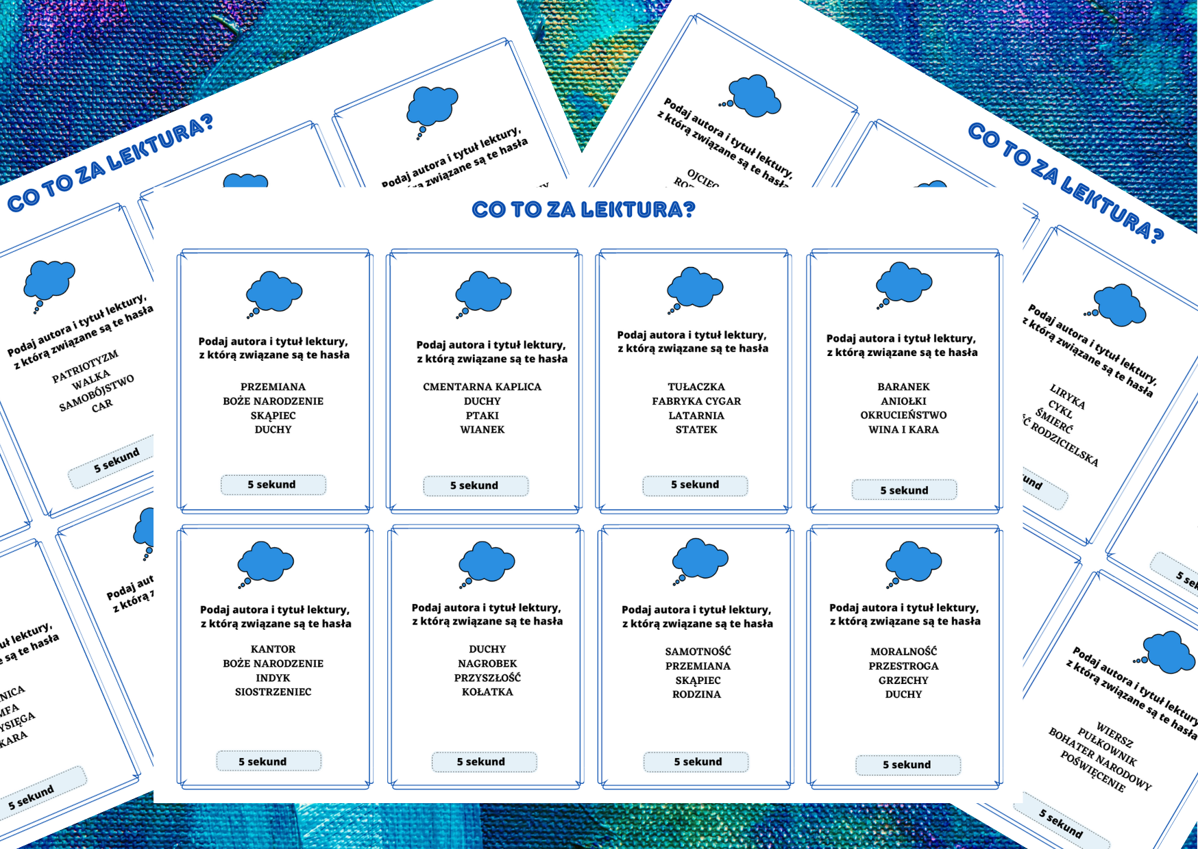 Zestaw 12 kart (format A4 pdf) z 96 karteczkami do gry „5 sekund”, zawierającymi po 4 hasła związane z lekturami obowiązkowymi z klas 7-8. Uczeń powinien wskazać tytuł i autora lektury, z którą kojarzy podane słowa. Materiał można wykorzystać je na lekcjach powtórzeniowych.