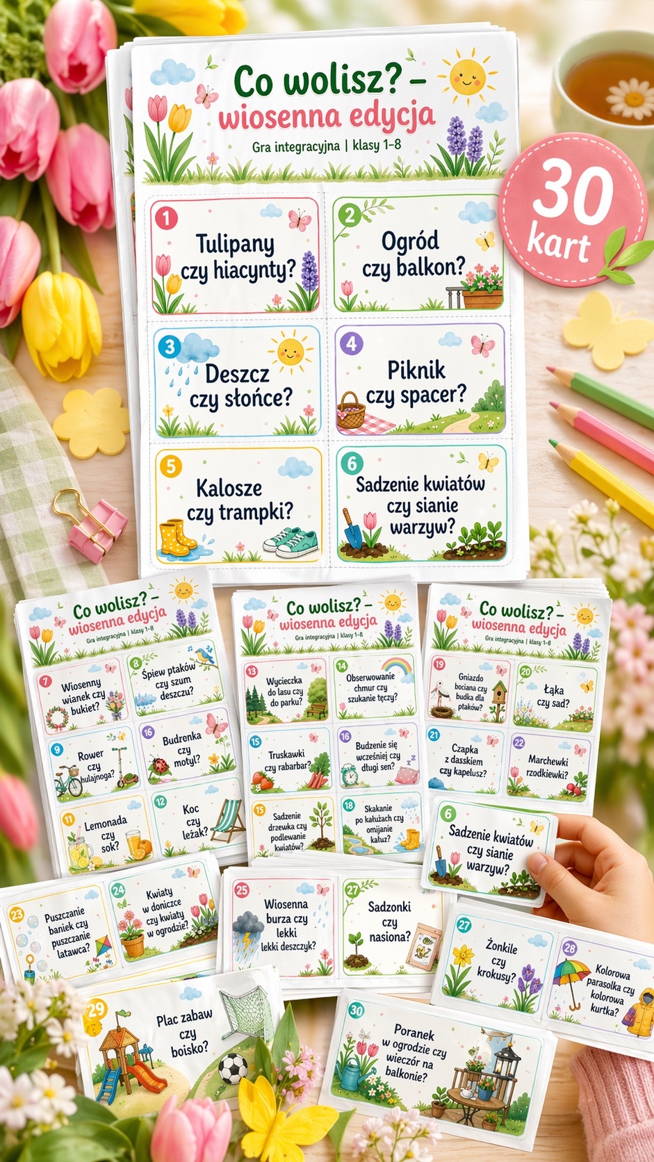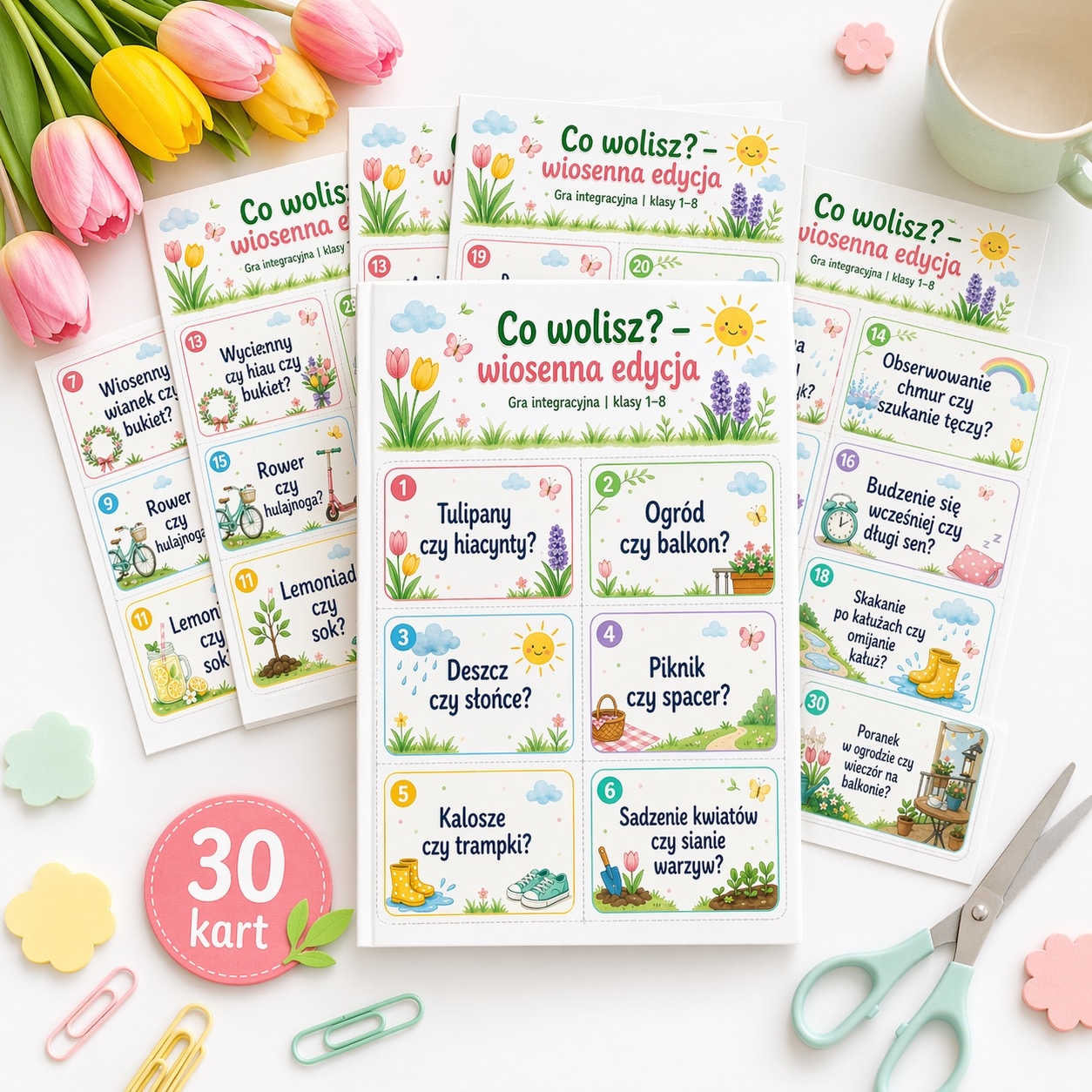 Przygotowałam wiosenną grę integracyjną dla uczniów klas 1–8. Materiał składa się z 30 kolorowych kart z pytaniami typu „Co wolisz?”, np. tulipany czy hiacynty?, ogród czy balkon?, deszcz czy słońce? albo piknik czy spacer?