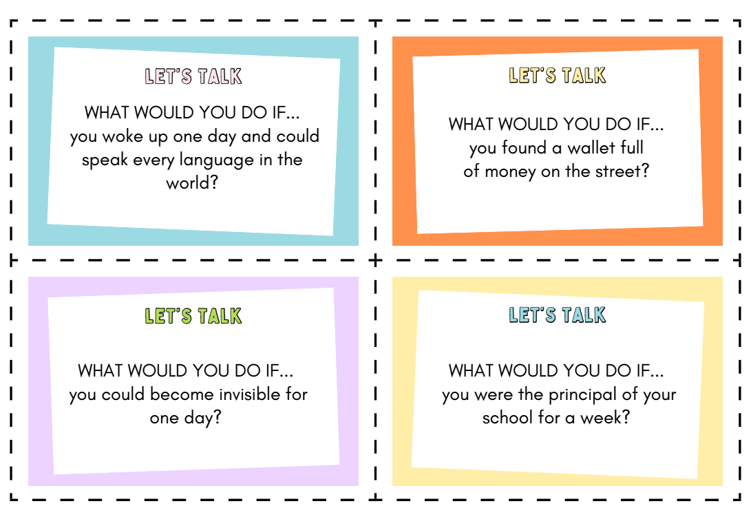 „Let’s Talk – What would you do if…” to zestaw kart konwersacyjnych w języku angielskim, które pomogą Twoim uczniom rozwijać umiejętność mówienia i stosowania drugiego trybu warunkowego (Second Conditional) w naturalny i ciekawy sposób.