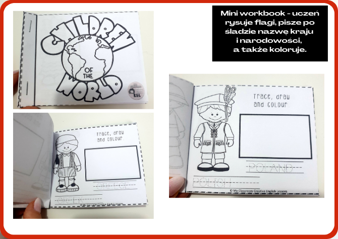 mini workbook - uczeń rysuje flagi, pisze po śladzie nazwę kraju i narodowości, a także koloruje.