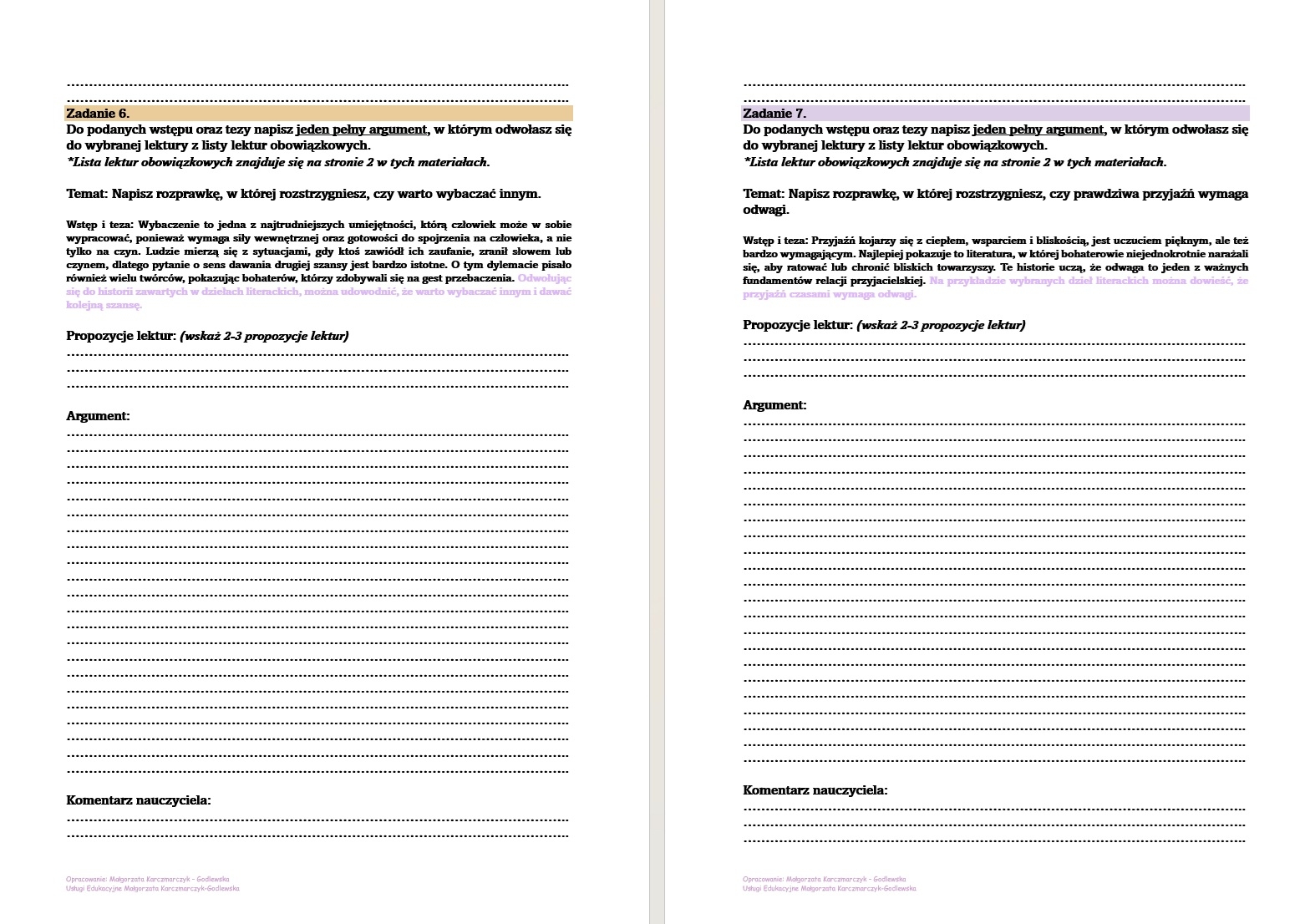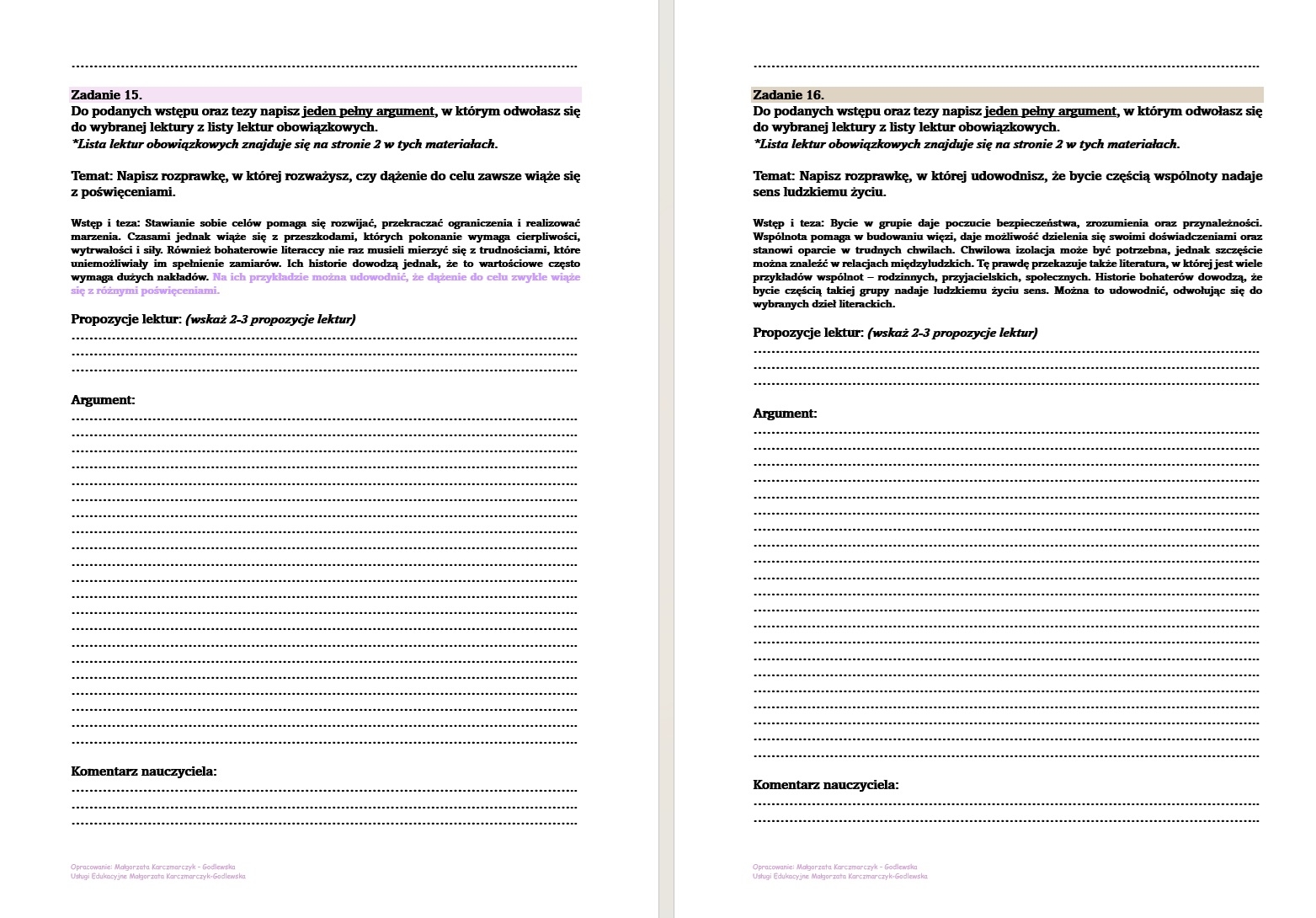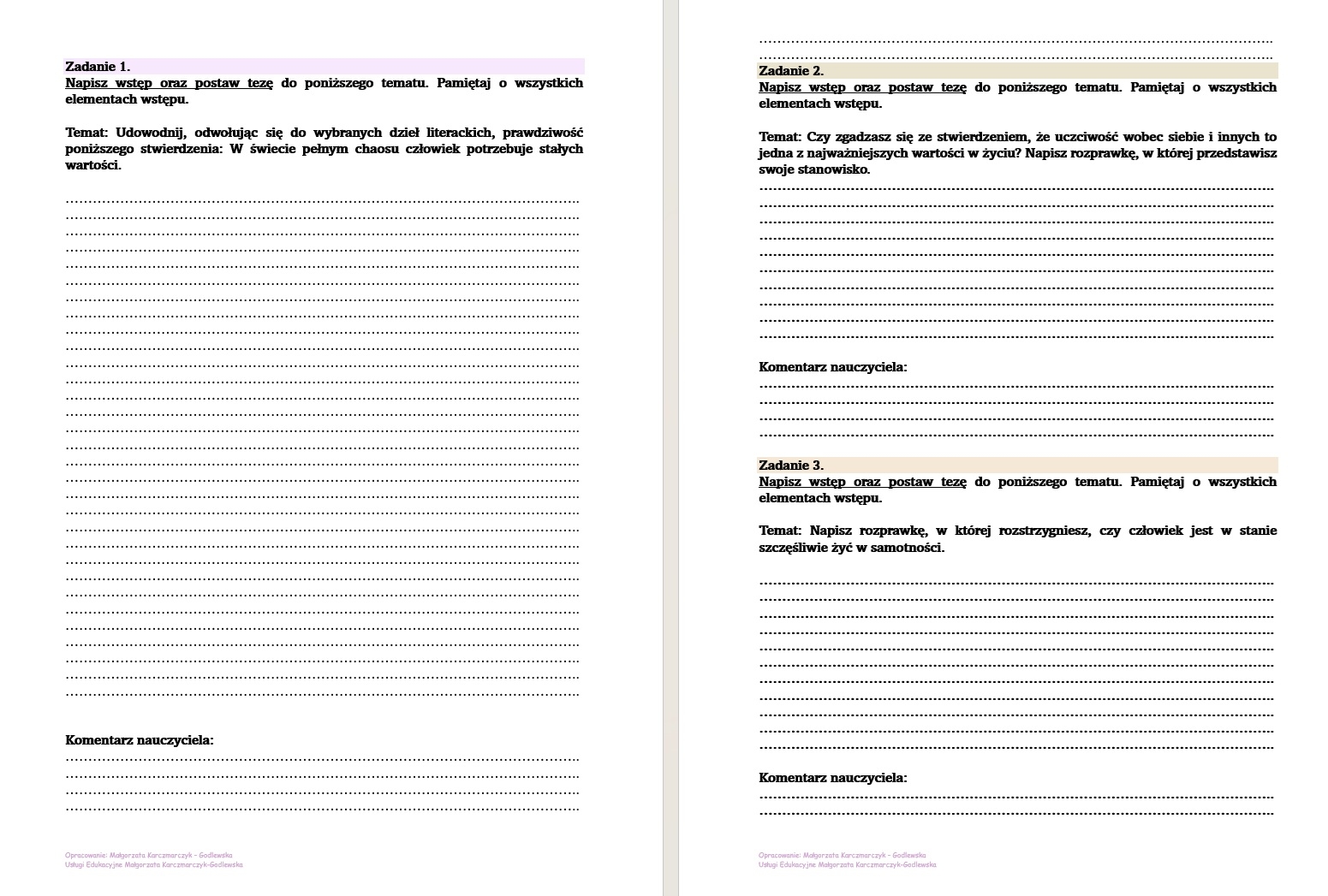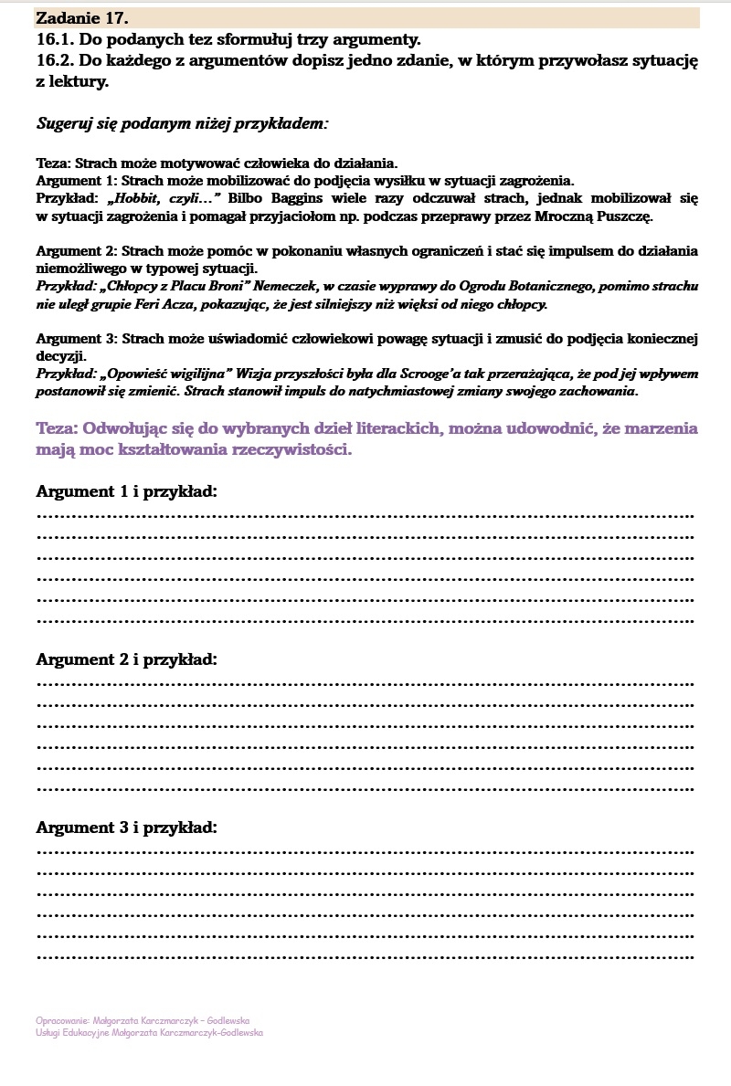 20 zadań do redagowania poszczególnych elementów rozprawki.