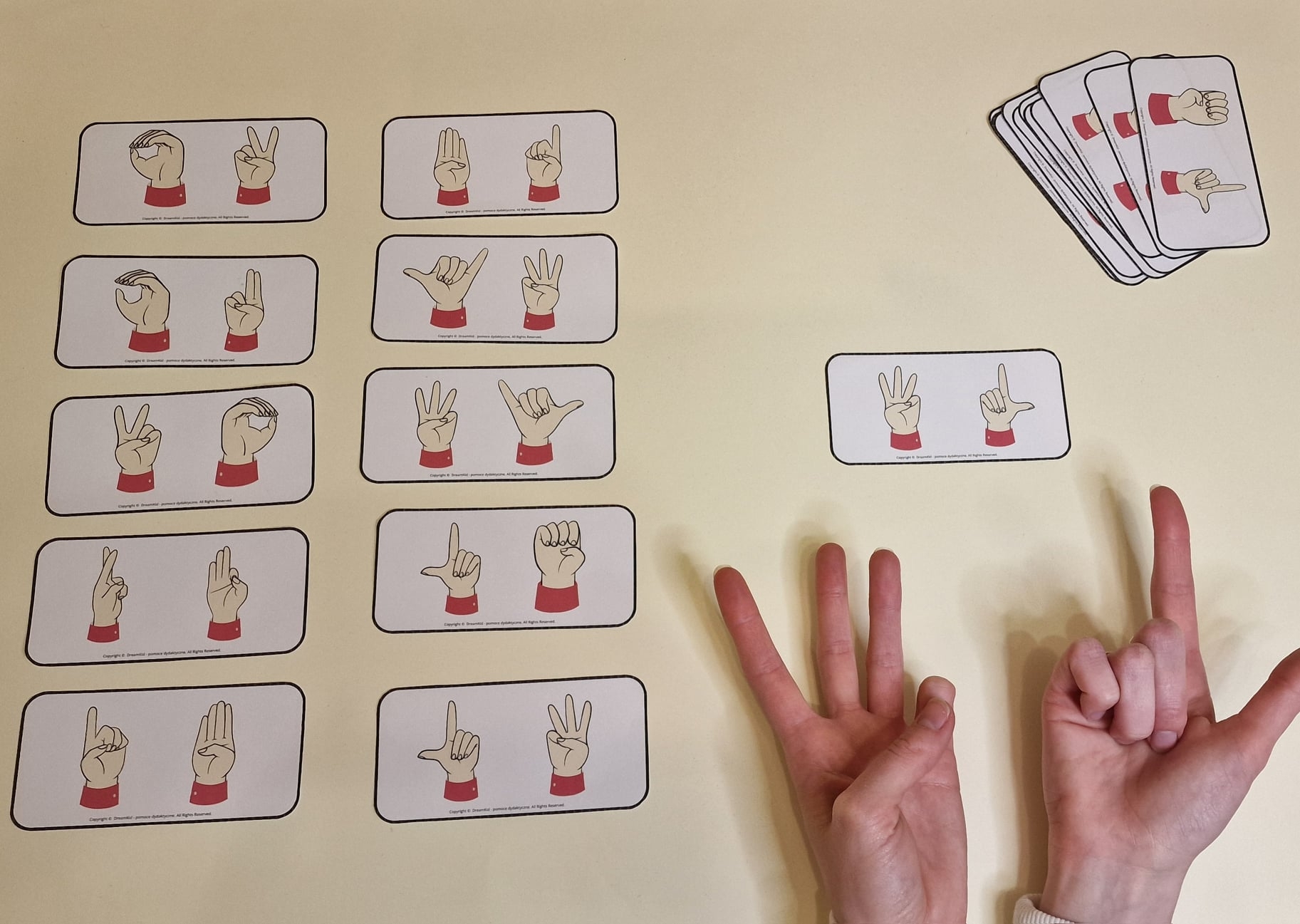 Zestaw zawiera 60 kart. Zadaniem dziecka jest odwzorować układ dłoni przedstawionych na karcie.