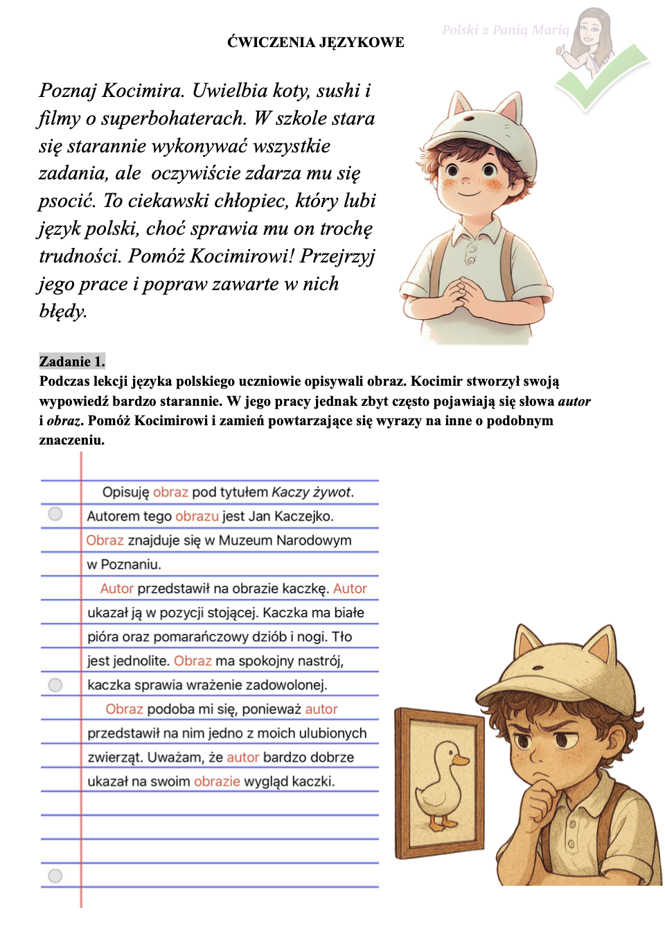Karta pracy zawiera 17 autorskich ćwiczeń z zakresu poprawności językowej oraz wzbogacania słownictwa, m.in.: - usuwanie powtórzeń z tekstu, - synonimy i antonimy, - grupowanie wyrazów, - związki frazeologiczne, - łączenie zdań pojedynczych w zdania złożone, - tworzenie definicji wyrazów, - wypisywanie wyrazów ze wskazaną cząstką, - poprawianie błędów językowych, - przekształcanie mowy niezależnej w zależną, - układanie zdań z podanymi wyrazami. Wszystko w towarzystwie sympatycznego Kocimira i jego psotnego kota - Bonifacego. Kartę pracy można wykorzystać jako całość lub podzielić na pojedyncze zadania i stosować je np. jako "rozgrzewkę" na rozpoczęcie lekcji.