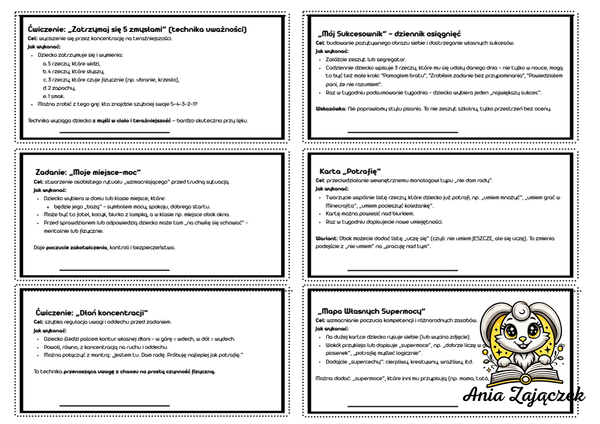 - budowania wewnętrznej siły i obrazu siebie („Jestem kimś więcej niż…”, „Moje zdania mocy”),