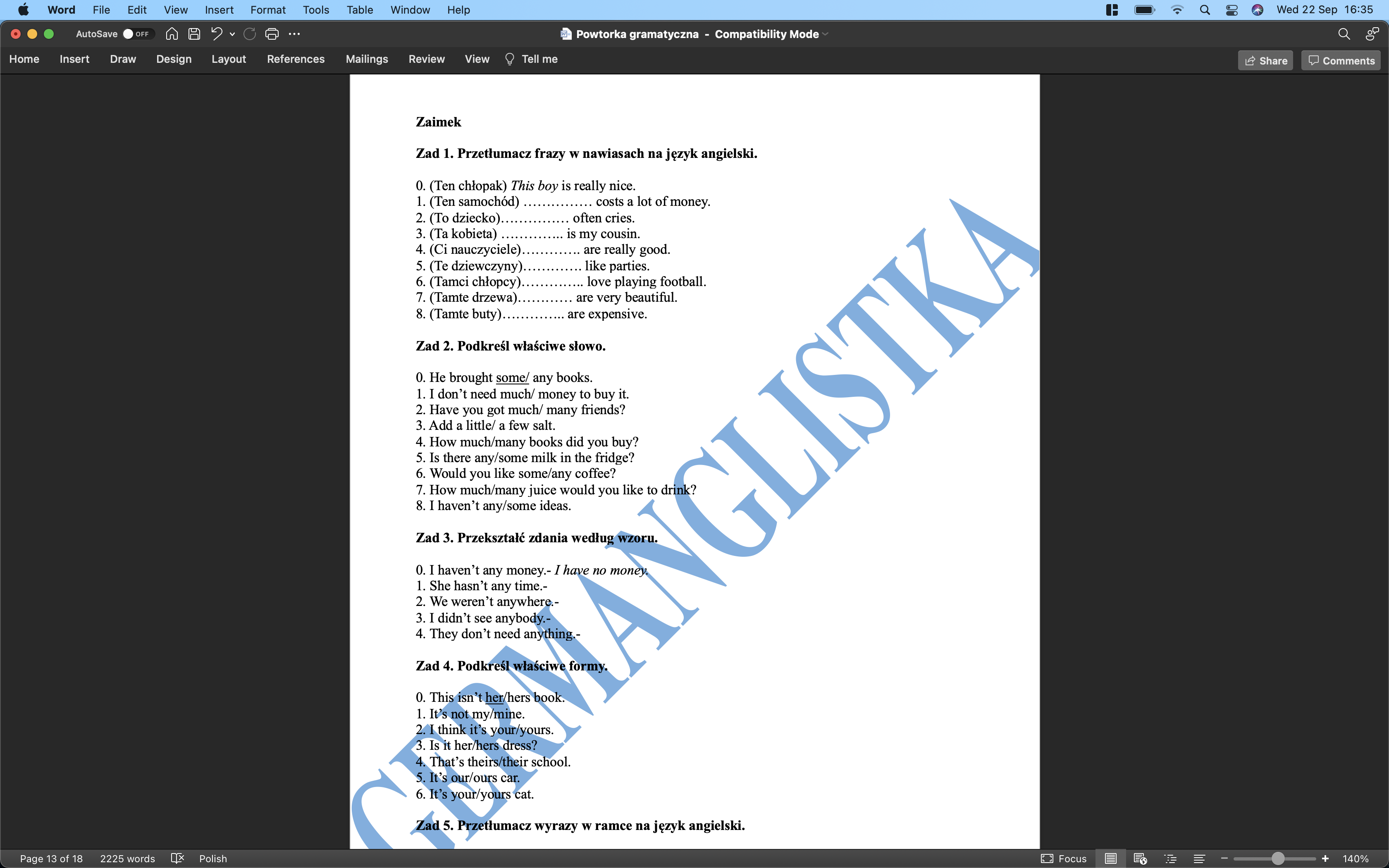 Ćwiczenia powtórzeniowe dla ósmoklasisty (rzeczownik, przymiotnik i przysłówek, przedimek, przyimek, liczebnik, zaimek, czasownik)