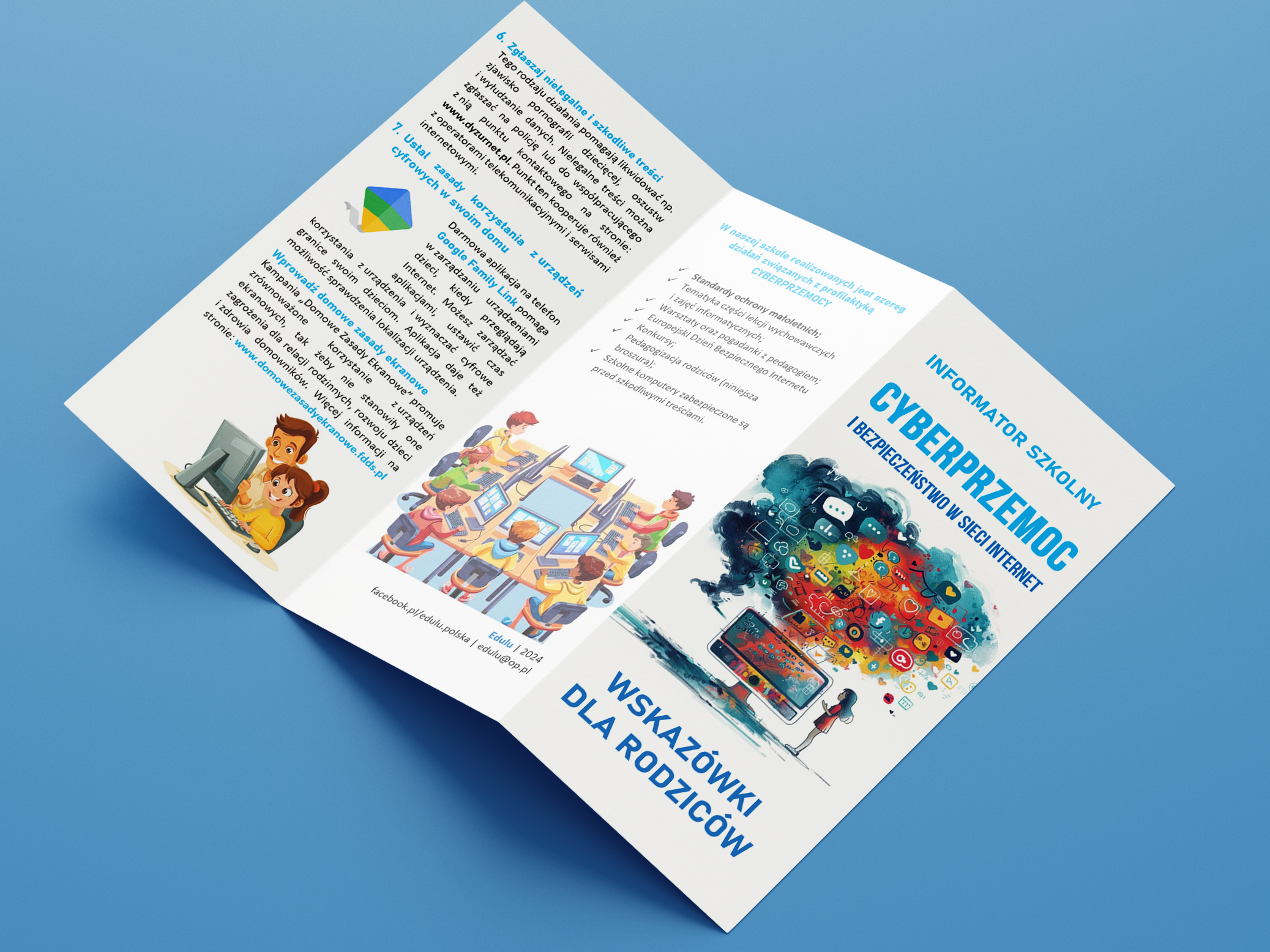 Pedagogizacja rodziców w formie Informatora Szkolnego lub innej placówki: Cyberprzemoc i bezpieczeństwo w sieci Internet - wskazówki dla rodziców, który możesz w łatwy sposób edytować do potrzeb szkoły. Wydrukuj dwustronnie tyle ile potrzebujesz, złóż i gotowe!