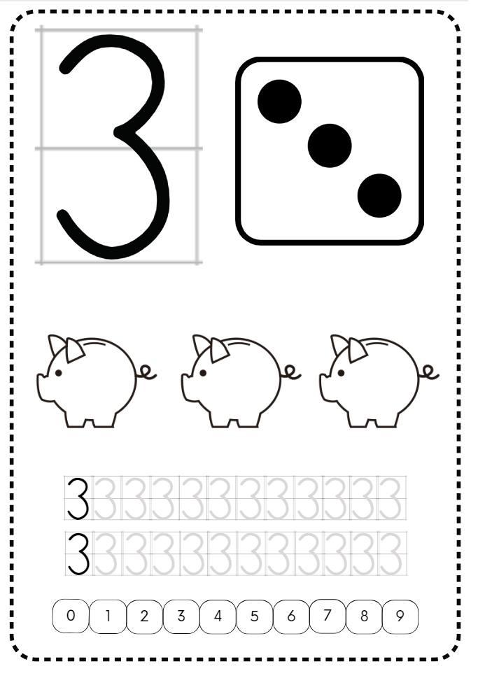 Zestaw 10 kart pracy z cyframi 0-9.  Zapis pismem szkolnym, obrazek z odpowiednią liczbą elementów i ciąg liczb z oznaczeniem.  Pisanie po śladzie.  Plik pdf 10 stron do samodzielnego wydruku.