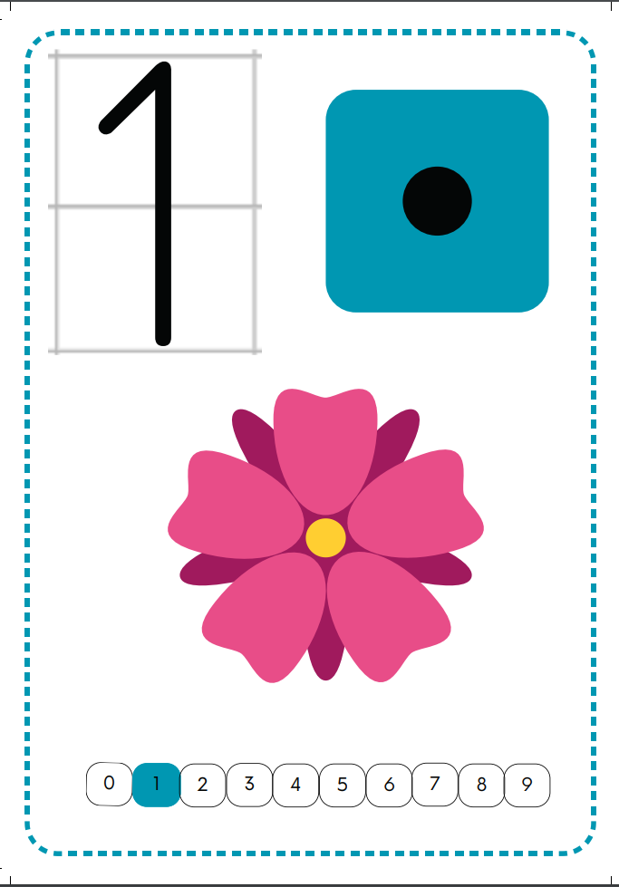 Zestaw 10 kolorowych plasz z cyframi 0-9.  Zapis pismem szkolnym, obrazek z odpowiednią liczbą elementów i ciąg liczb z oznaczeniem.  Plik pdf 10 stron do samodzielnego wydruku.