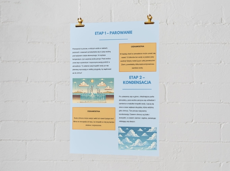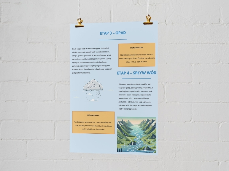 Poznaj fascynujący świat wody w formie przyjaznej, kolorowej broszury (lub plakatu), która w prosty sposób wyjaśnia wszystkie etapy jej wędrówki: od parowania aż po spływ rzekami do mórz i oceanów. Materiał został stworzony z myślą o dzieciach w wieku szkolnym, ale z powodzeniem skorzystają z niego również rodzice, nauczyciele i pasjonaci przyrody w każdym wieku.