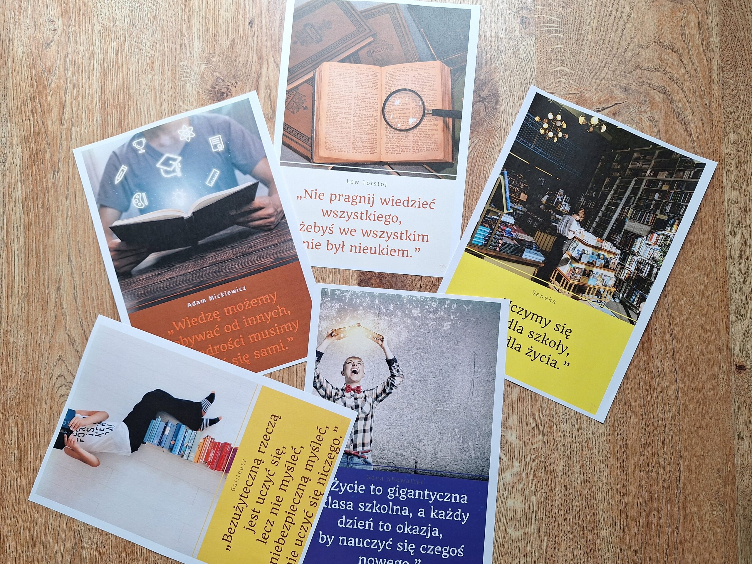 Oto moja kolejna propozycja, która może pomóc Wam zagospodarować tablicę. Całość składa się z 10 kolorowych plansz, a na każdej z nich oprócz kolorowej grafiki znajdziecie ciekawy cytat związany z edukacją i nauką.