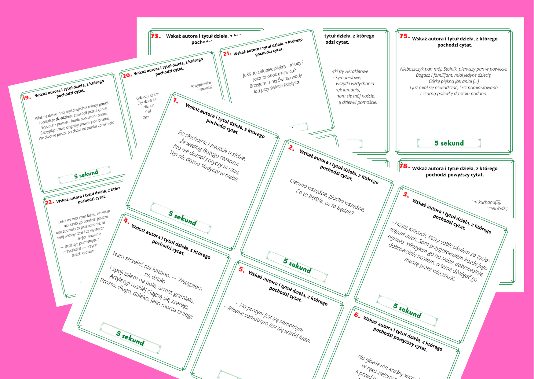 Zestaw 13 kart z 78 karteczkami do gry „5 sekund”, zawierającymi cytaty z lektur obowiązkowych w kl.7-8. Można wykorzystać je na lekcjach powtórzeniowych. Karty należy wyciąć i ewentualnie zalaminować, by dłużej posłużyły. Można także wydrukować je na kolorowym papierze.