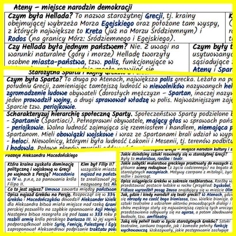 Zestaw notatek w formie pytań i odpowiedzi do zagadnień związanych z kulturą i historią starożytnej Grecji przygotowany dla klasy 5 według podstawy programowej nauczania historii w szkole podstawowej (Podstawa programowa – Historia – Szkoła podstawowa IV-VIII).