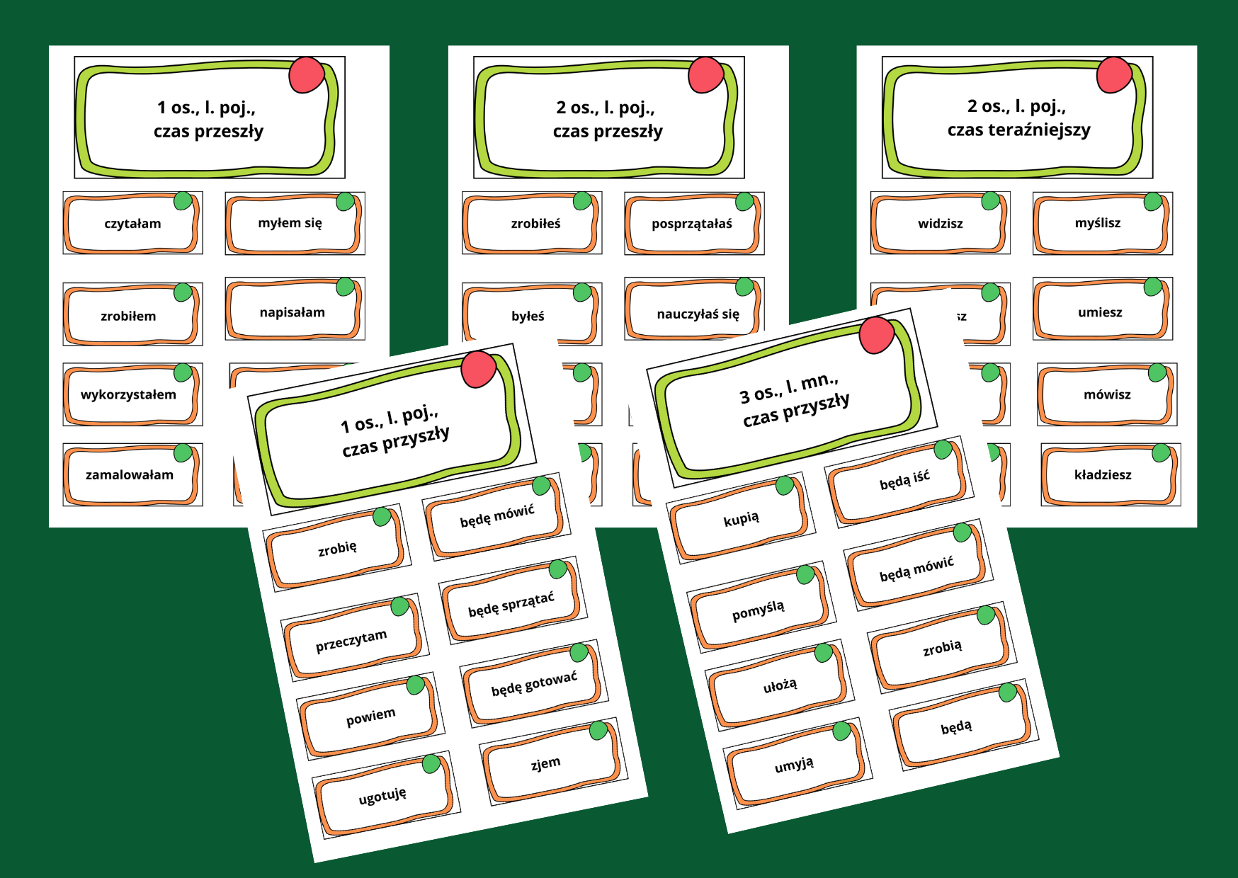 Materiał zawiera 18 stron pdf, na których znajdują się czasowniki w różnych formach fleksyjnych (wszystkie osoby, liczby, czasy). Fiszki należy wyciąć ( polecam wcześniej zalaminować - posłużą dłużej). Zadanie uczniów polega na dopasowaniu fiszek z czasownikami do większych fiszek z podanymi na nich formami. Można wykorzystać wszystkie fiszki, można też podzielić je na partie (np. fiszki tylko z czasem teraźniejszym). Inny pomysł to wydrukowanie fiszek np. 4 strony na jednej i rozdanie uczniom do wklejenia w zeszycie.