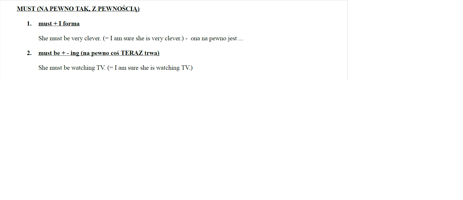 np.: 1. must + I forma She must be very clever. (= I am sure she is very clever.) - ona na pewno jest ... 1. She /na pewno nie mieszkała/ in this hotel.