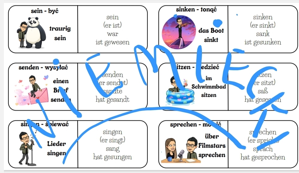 110 czasowników nieregularnych w czasach przeszłych przedstawione w przystępny sposób dla młodzieży z wykorzystanie naklejek Bitmoji. Na każdej karcie znajduje się czasownik w bezokoliczniku wraz z tłumaczeniem i możliwością użycia po lewej stronie, a po prawej znajdują się formy czasownika w bezokoliczniku, ich forma w 3. osobie liczby pojedynczej oraz formy czasów przeszłych. Karty można stosować jako fiszki (na jednej stronie czasownik i przykład użycia, a na drugiej formy w czasach przeszłych - można zagiąć i zalaminować) lub jako kartę obrazkową (zalaminować).