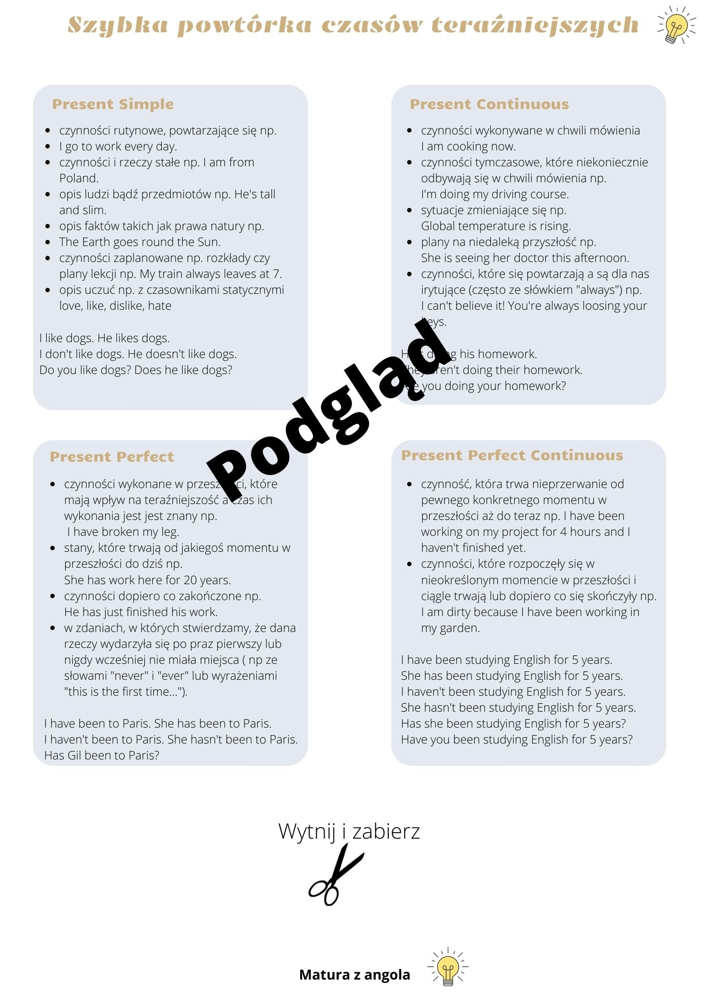 Bonus: ostatnia strona to zestawienie czasów w formie małych ściąg do wydruku.