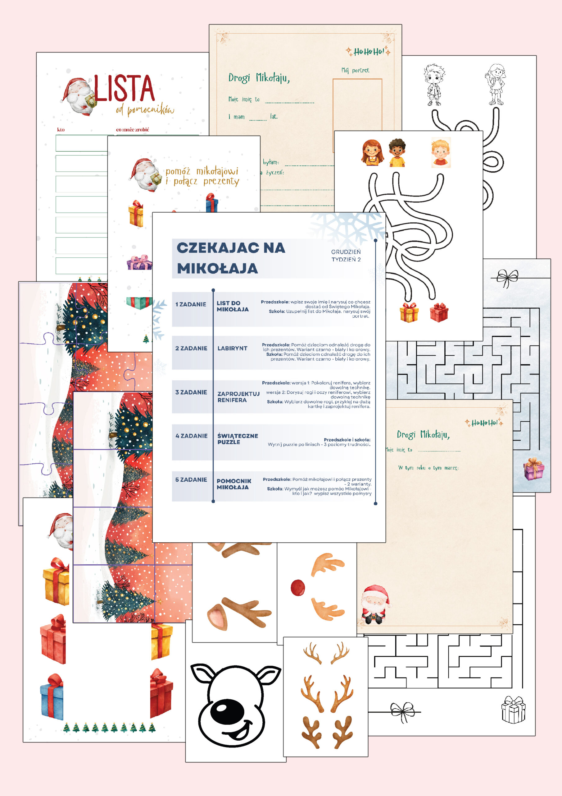 Zadania pełne emocji i dobroci: list do Świętego Mikołaja, świąteczne labirynty, zaprojektuj własnego renifera, pomóż Mikołajowi – dobre uczynki i uśmiechy, wytnij i ułóż świąteczne puzzle.