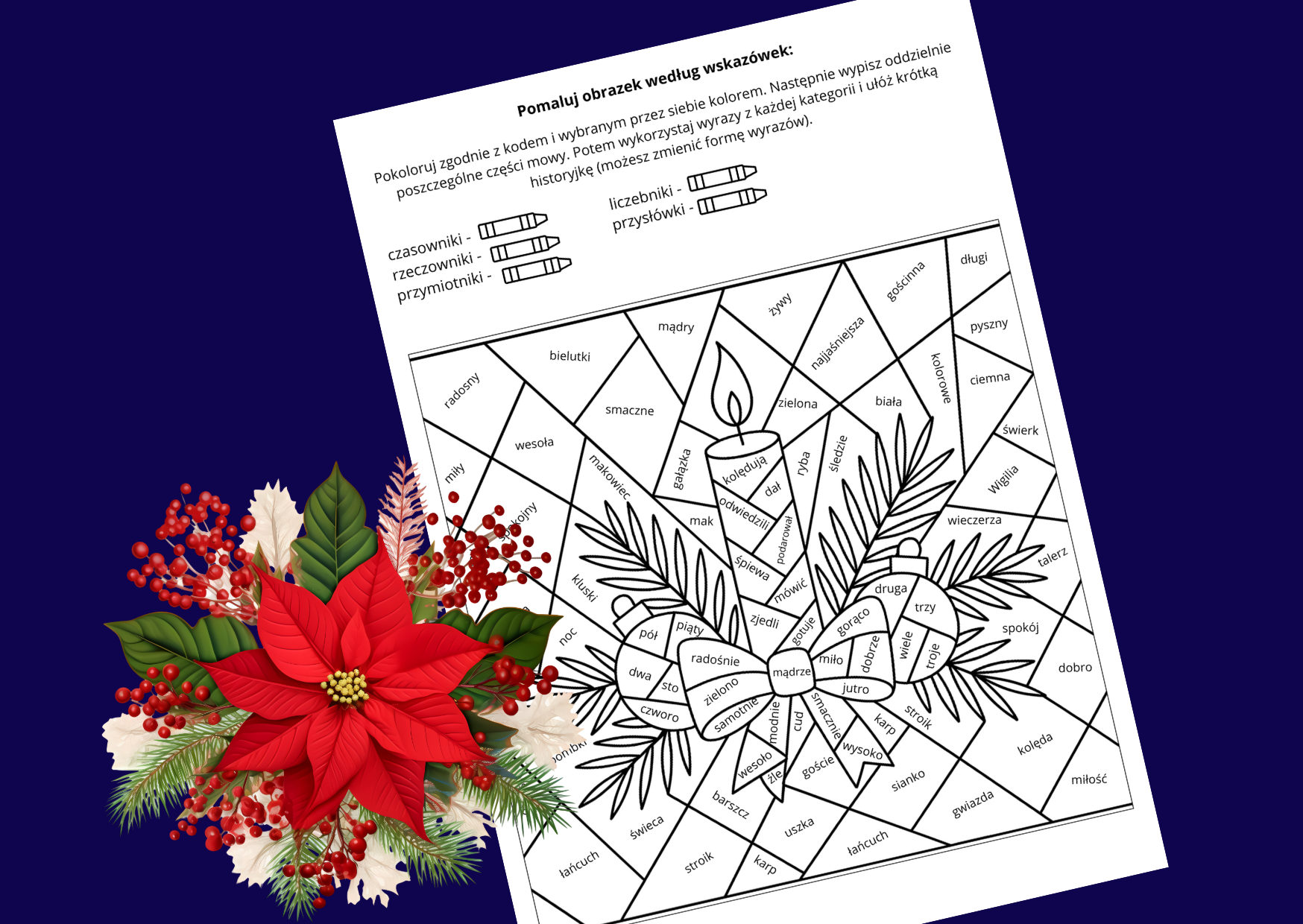 Ta wyjątkowa kolorowanka łączy świąteczny klimat z nauką o częściach mowy. Wokół stroika znajdują się wyrazy kojarzące się z Bożym Narodzeniem, które posłużą do rozwijania umiejętności językowych oraz kreatywnego pisania. Materiał zawiera wszystkie części mowy, więc najlepiej sprawdzi się w klasach 6-8. Zadanie dla ucznia: Pokoloruj obrazek według wskazówek: – Pokoloruj elementy zgodnie z kodem i wybranym przez siebie kolorem. – Wypisz oddzielnie poszczególne części mowy. – Wykorzystaj wyrazy z każdej kategorii i ułóż krótką historyjkę (możesz zmienić formę wyrazów). Kolorowanka świetnie sprawdzi się na lekcjach języka polskiego, zajęciach korekcyjno-kompensacyjnych, w bibliotece szkolnej lub jako świąteczna praca domowa. Idealna na grudniowe zajęcia!