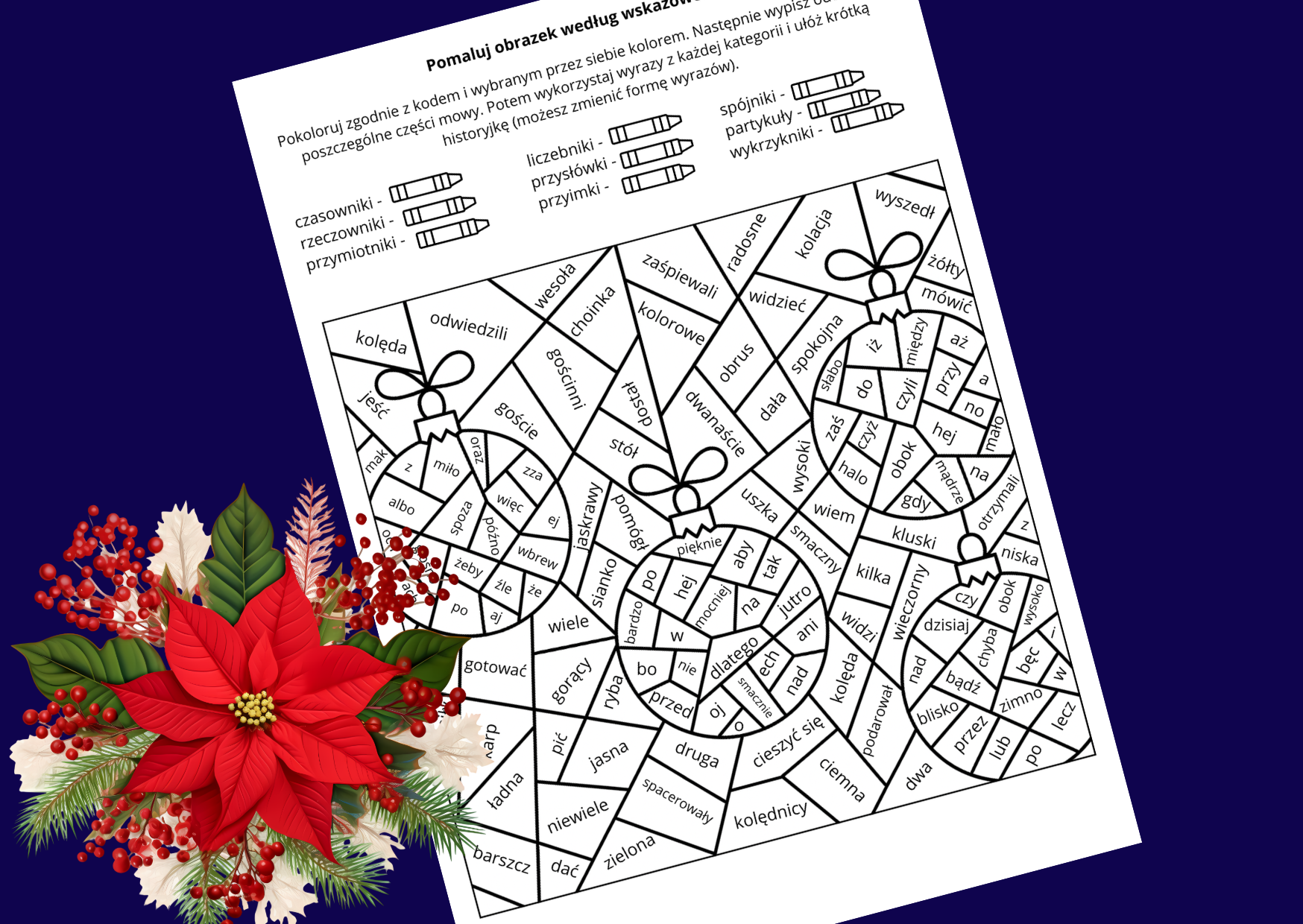Ta wyjątkowa kolorowanka łączy świąteczny klimat z nauką o częściach mowy. Wokół stroika znajdują się wyrazy kojarzące się z Bożym Narodzeniem, które posłużą do rozwijania umiejętności językowych oraz kreatywnego pisania. Materiał zawiera wszystkie części mowy, więc najlepiej sprawdzi się w klasach 6-8.