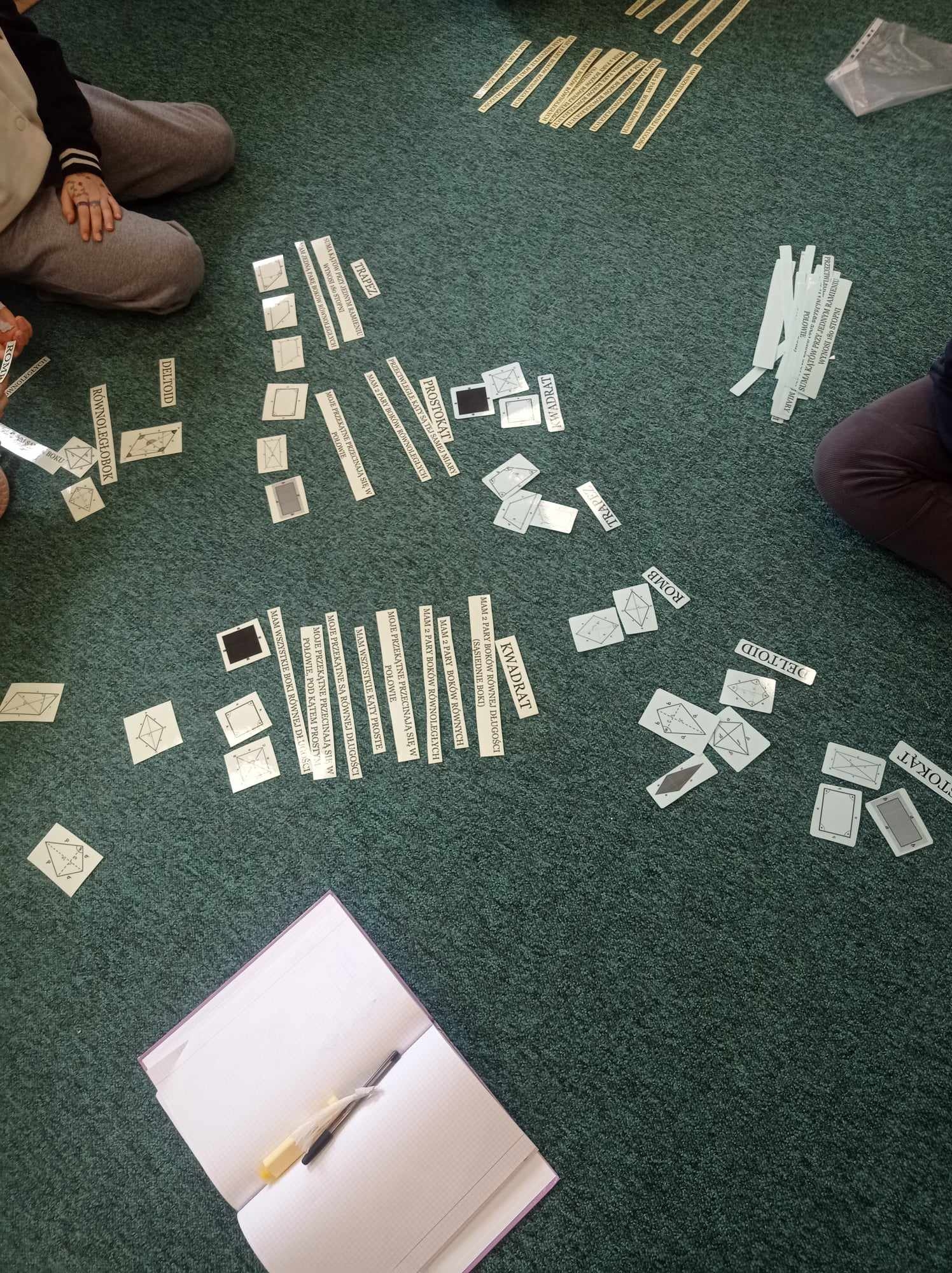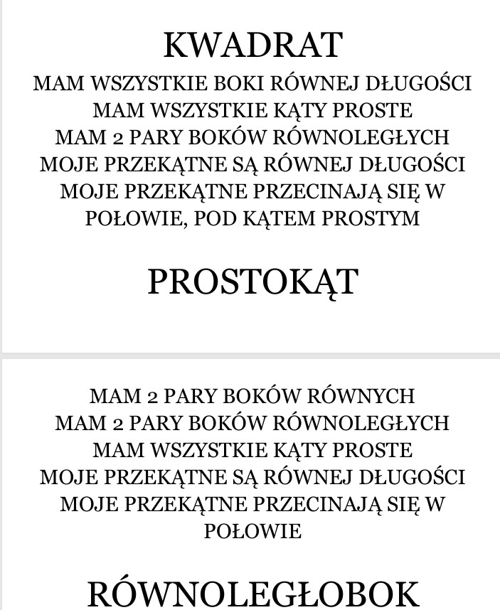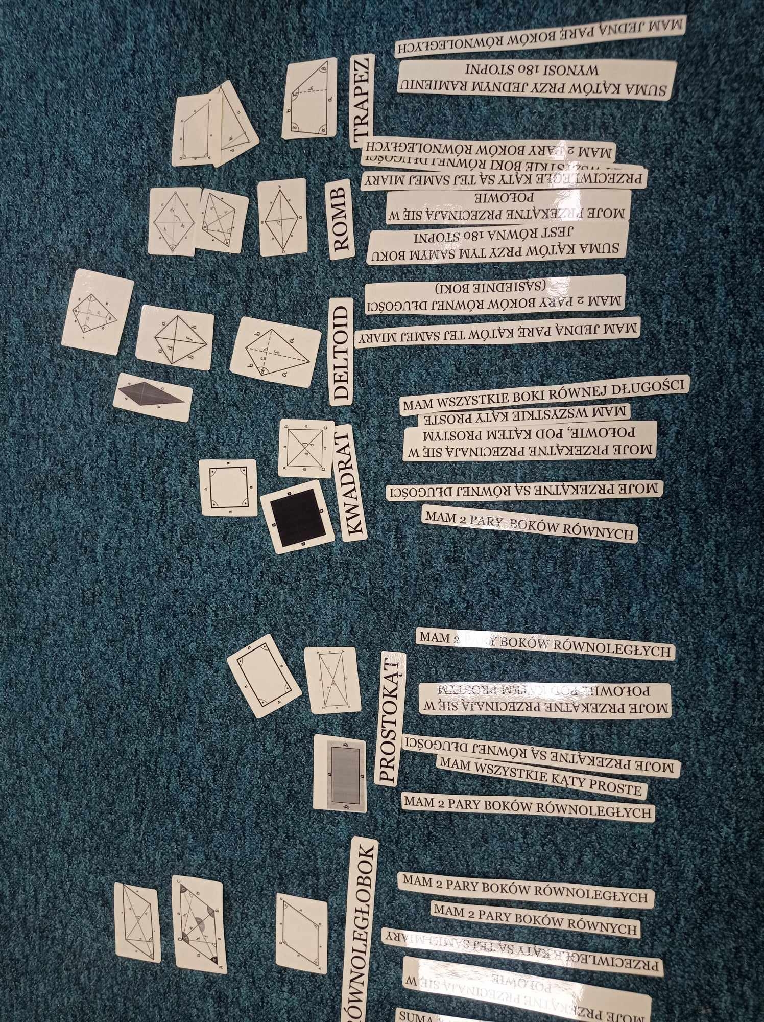 Każda z grup na początku lekcji otrzymuje pocięty zestaw nazw czworokątów, własności dotyczących boków, kątów i przekątnych oraz po 3 rysunki przedstawiające każdy z omawianych czworokątów.