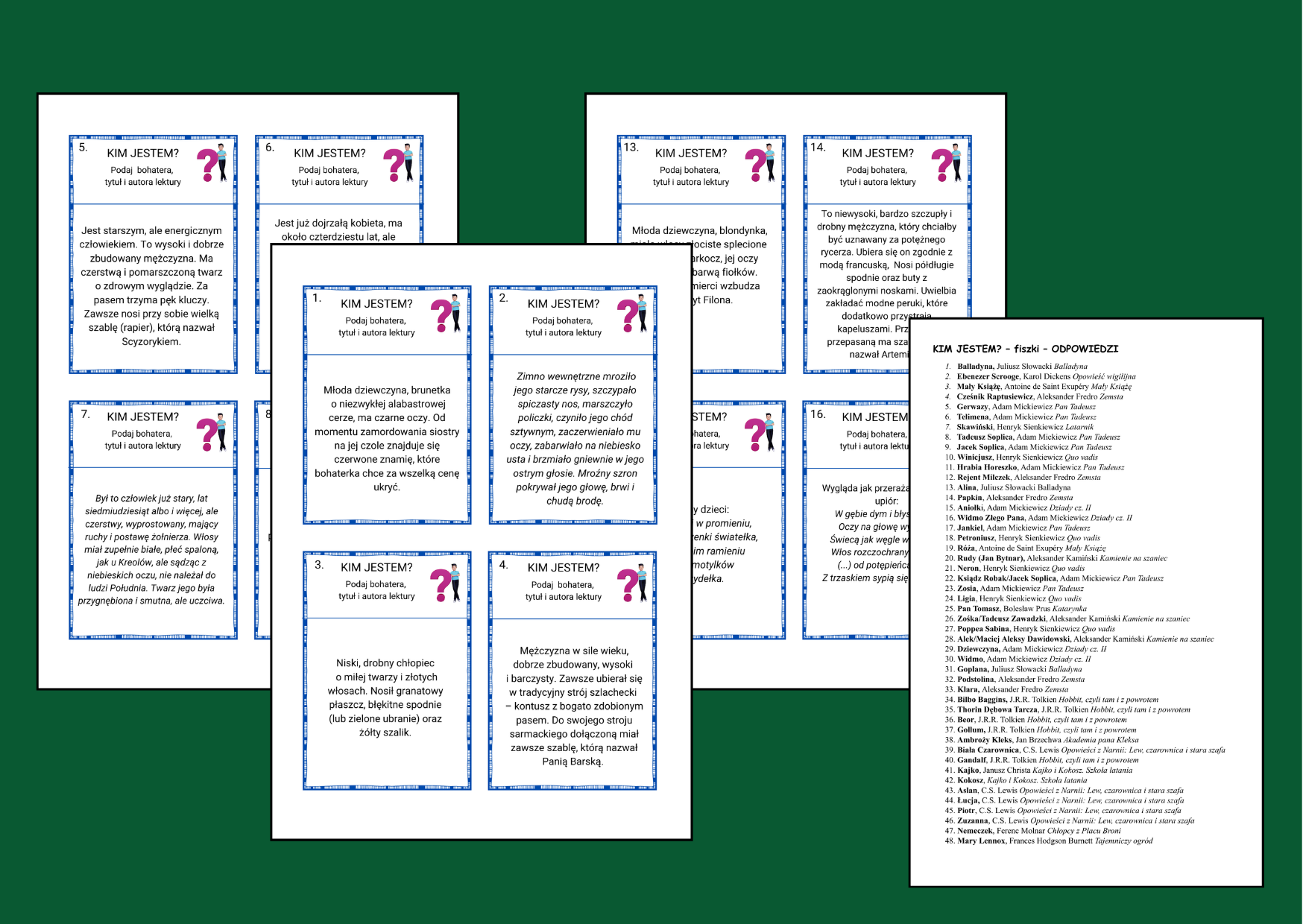 48 fiszek z krótkimi opisami wyglądu bohaterów lektur z klas 4-8. Zadanie uczniów polega na podaniu bohater oraz autora i tytułu lektury. Świetny materiał na zajęcia powtórzeniowe. Dodałam odpowiedzi.