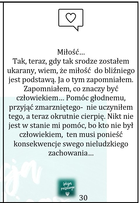 Polega na przypomnieniu losów bohaterów wybranych lektur obowiązkowych i nieobowiązkowych, ze szczególnym uwzględnieniem wątku miłosnego w losach postaci. Karty z hipotetycznymi wypowiedziami bohaterów są ich refleksjami na temat miłości, nie tylko tej romantycznej, ale i miłości do bliźniego, dziecka, ojczyzny itp.