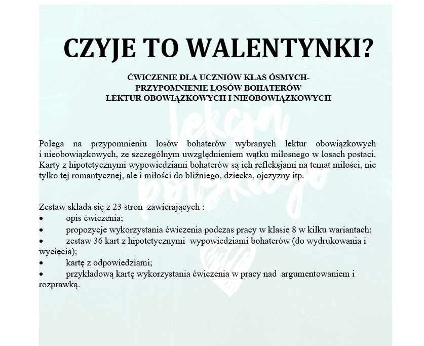 CZYJE TO WALENTYNKI? ĆWICZENIE DLA UCZNIÓW KLAS ÓSMYCH - PRZYPOMNIENIE LOSÓW BOHATERÓW LEKTUR OBOWIĄZKOWYCH I NIEOBOWIĄZKOWYCH