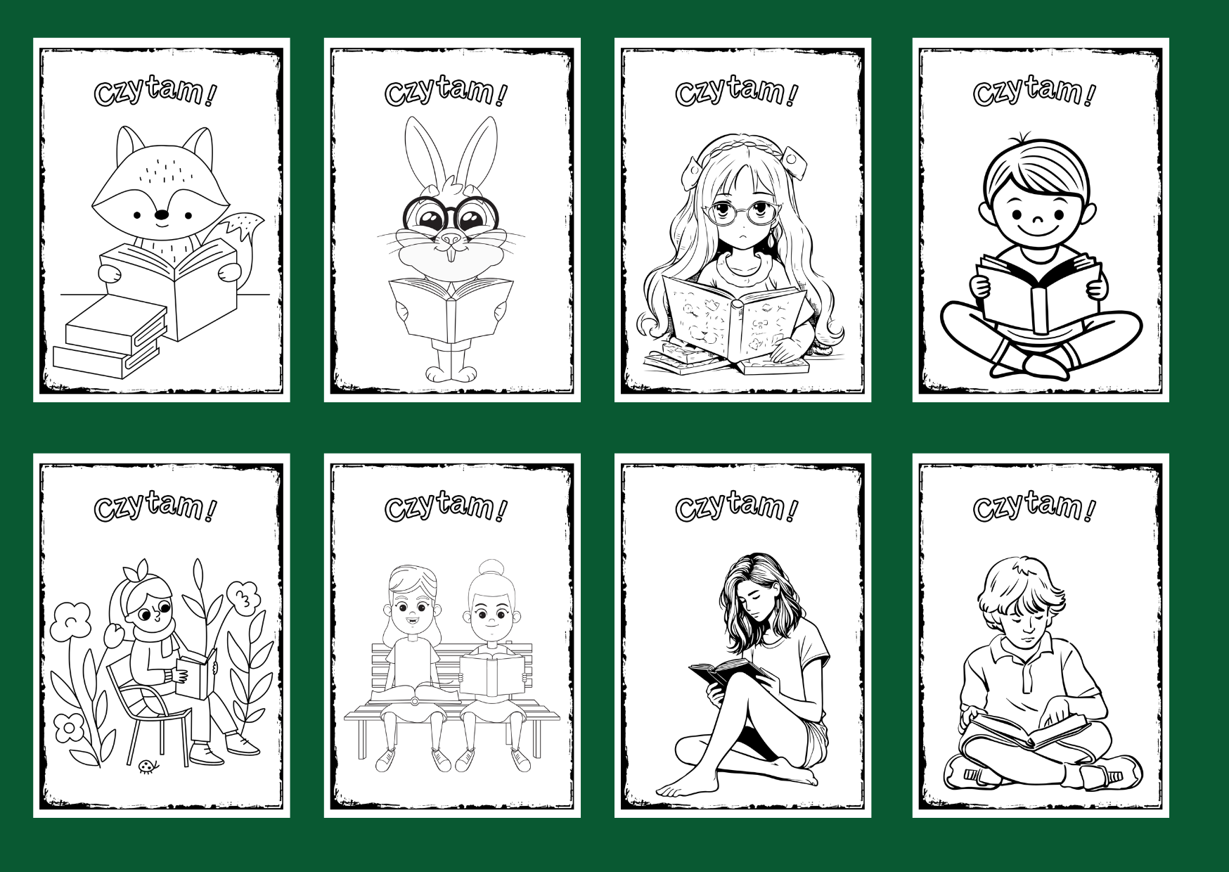 Materiał zawiera 36 kolorowanek z napisem "Czytam!" i ilustracją związaną z czytaniem oraz stronę tytułową. Po pomalowaniu przez dzieci kolorowanek, można stworzyć gazetkę.