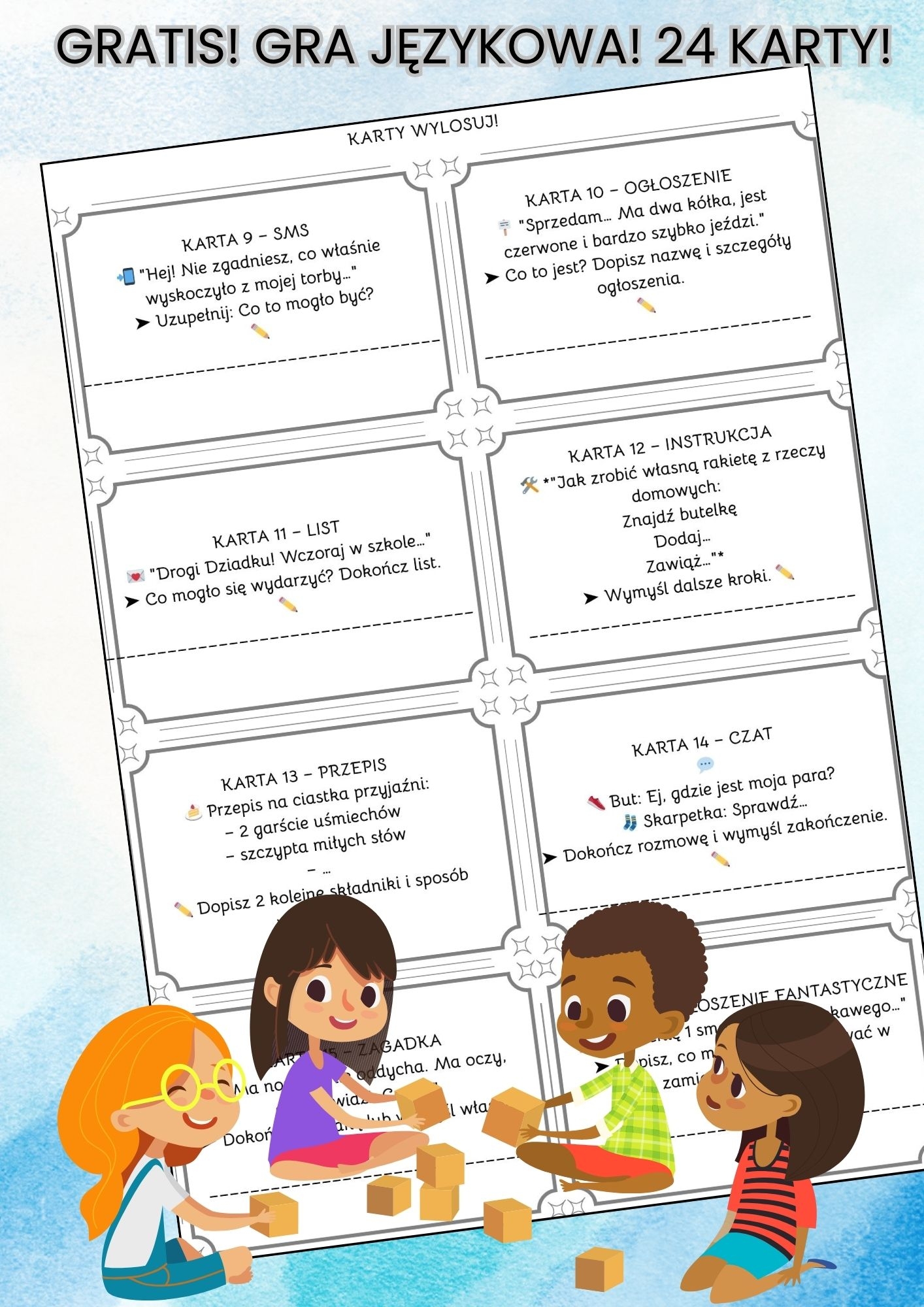 Karty „Zgubił się fragment!” – gra językowo-tekstowa.