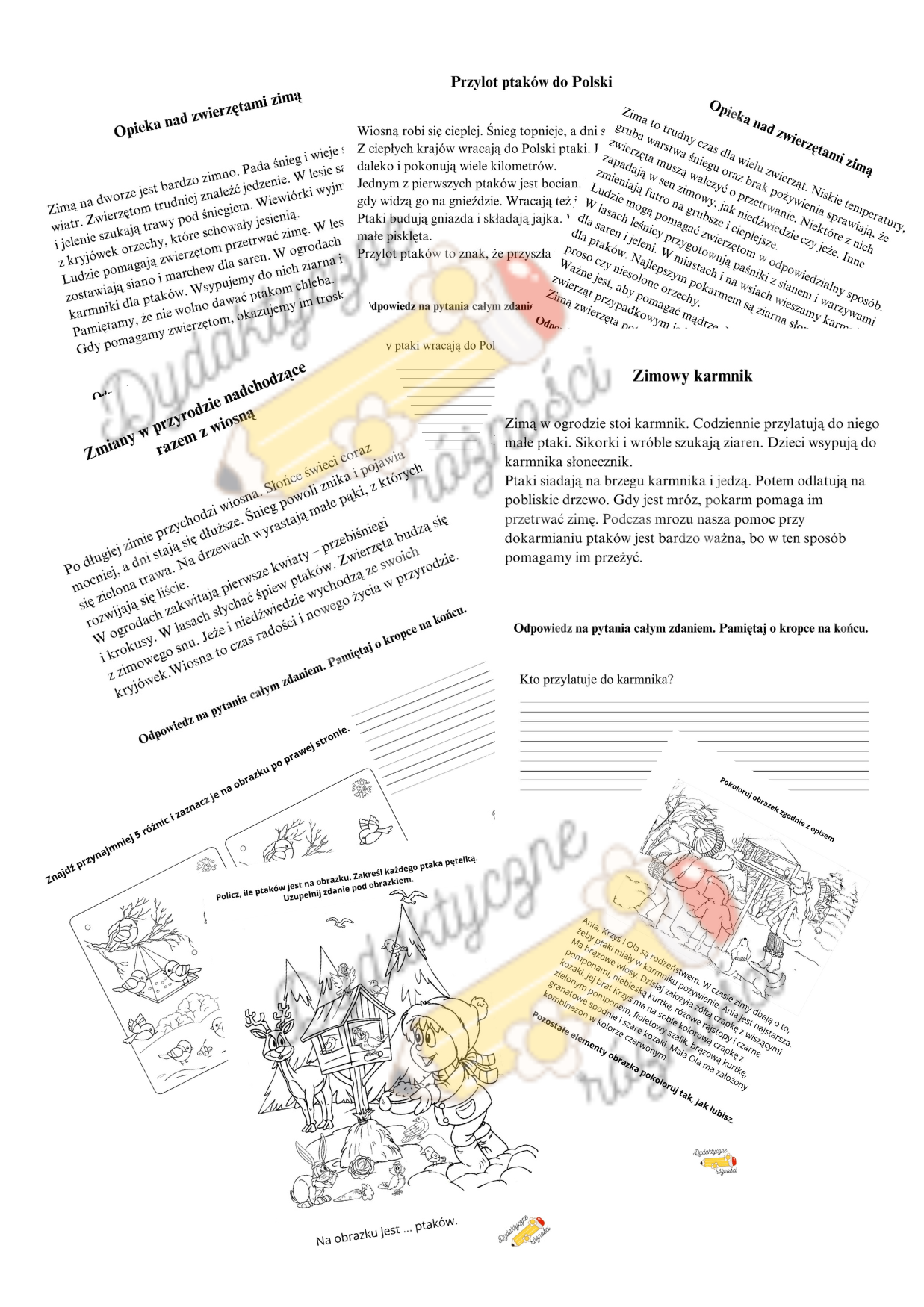 Każda z pięciu kart zawiera tekst + 4 pytania wymagające odpowiedzi całym zdaniem. W gratisie są 3 karty pracy współgrające z tematyką tekstów i obejmujące zadania graficzne typu - kolorowanie zgodnie z tekstem, szukanie różnic, poszukiwanie, zaznaczanie pętlą i liczenie elementów na obrazku.