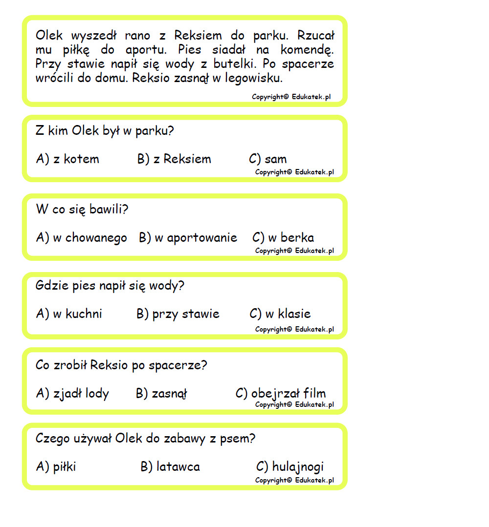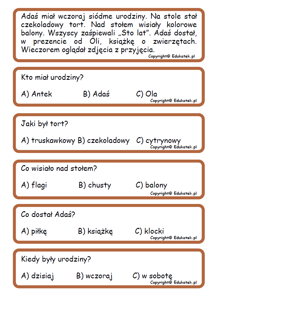W skład zestawu wchodzi 20 tekstów oraz 100 pytań (po 5 do każdego tekstu). Komplet liczy 20 stron do samodzielnego wydrukowania.