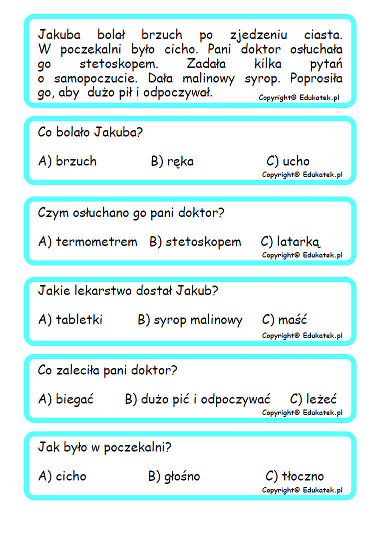 Teksty oraz pytania należy wydrukować, najlepiej zalaminować. W zależności od pomysłu osoby prowadzącej i ilości dzieci biorących udział w zabawie należy przygotować właściwą ilość kart.