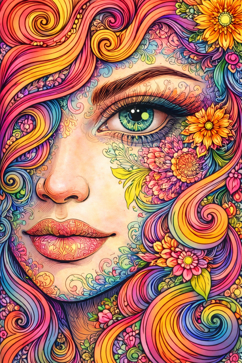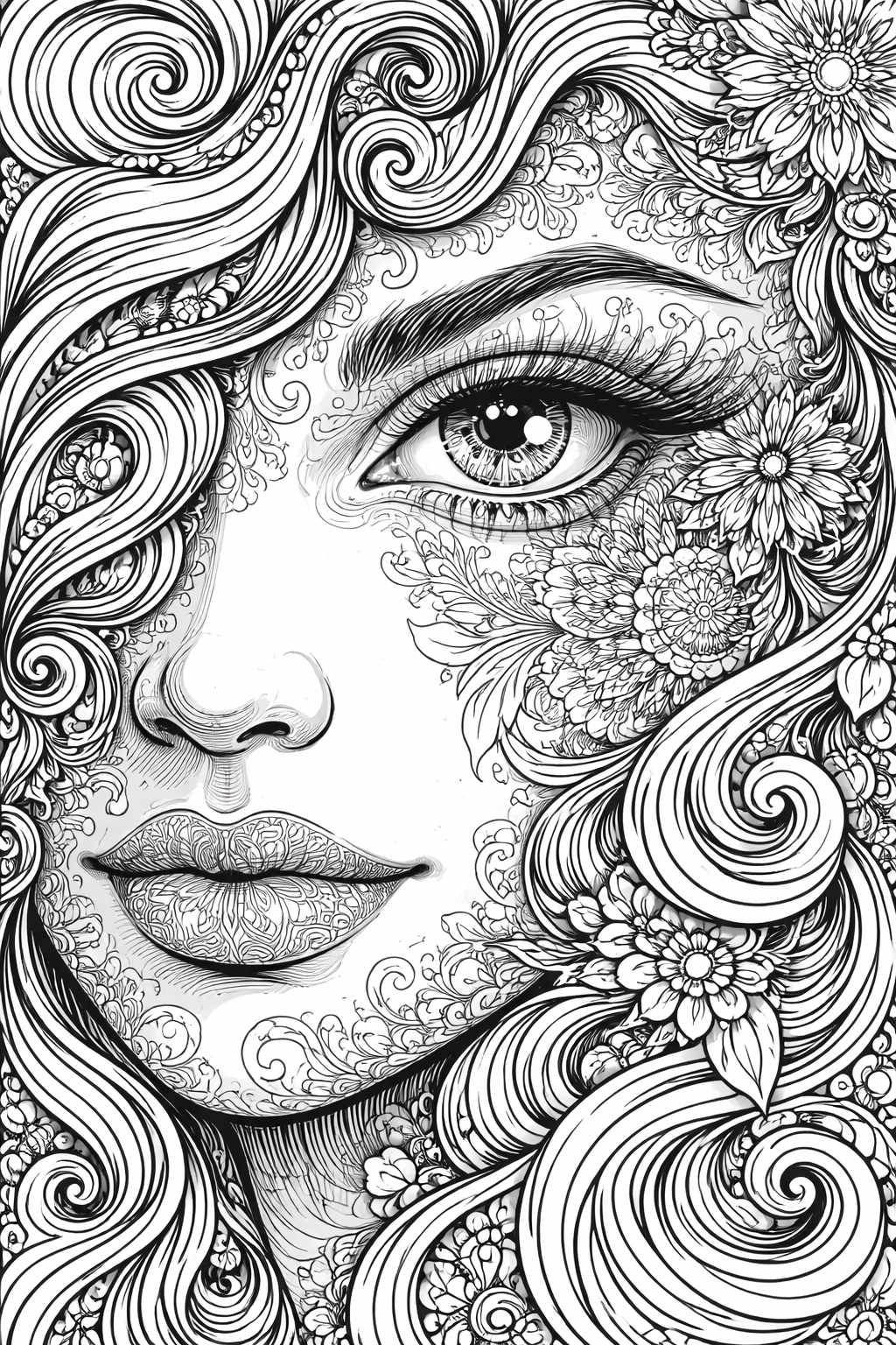 Misterny portret kobiety z falującymi włosami i motywami kwiatów - idealna kolorowanka antystresowa do druku. Pobierz, wydrukuj i zrelaksuj się przy detalach!