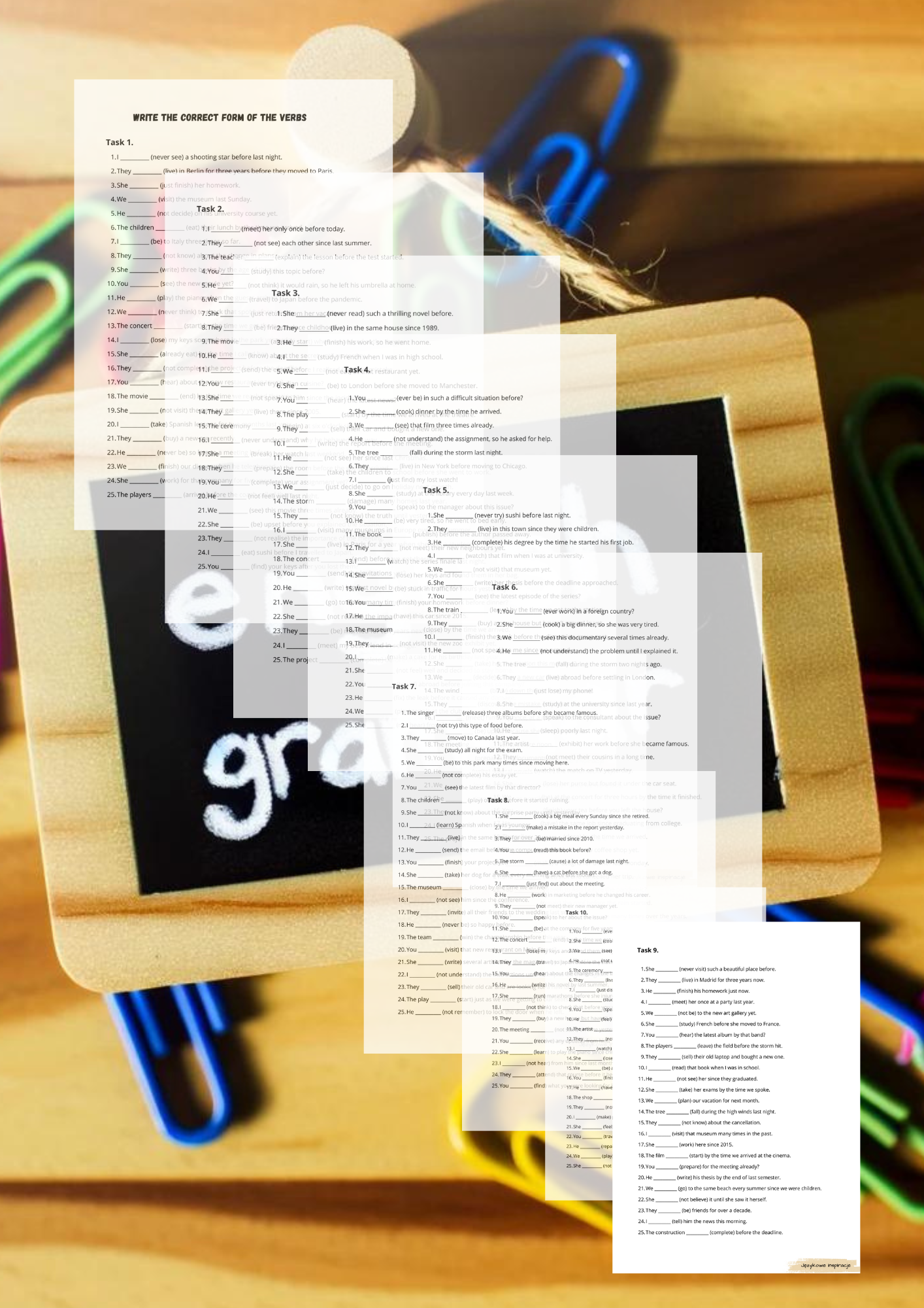 W pliki znajdziecie 250 zdań w czasach: past simple, present perfect oraz past perfect.