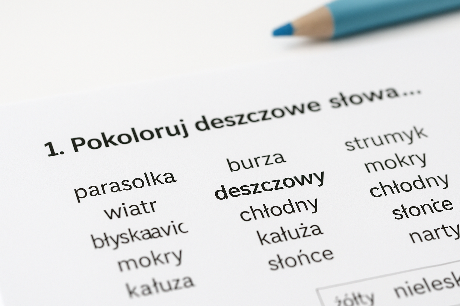 Dzieci kolorują rzeczowniki, czasowniki i przymiotniki związane z deszczem, co utrwala kategorię gramatyczną w sposób prosty i przyjemny.