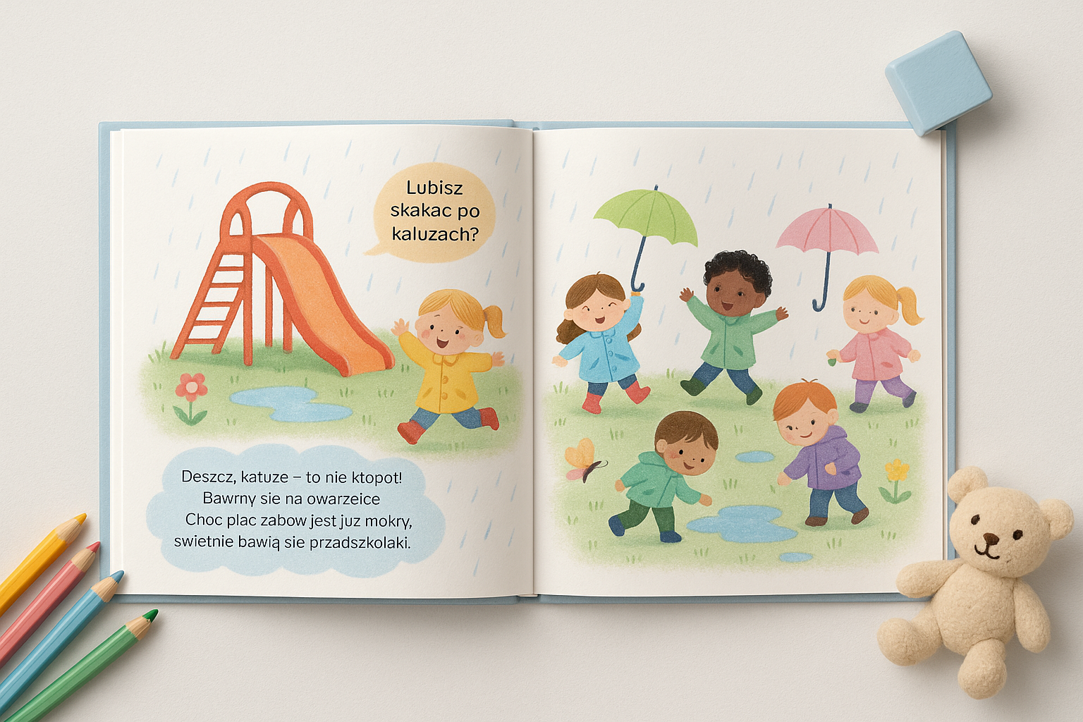 ✔️ Inspiruje do rozmów o emocjach, przyrodzie i… kałużach!