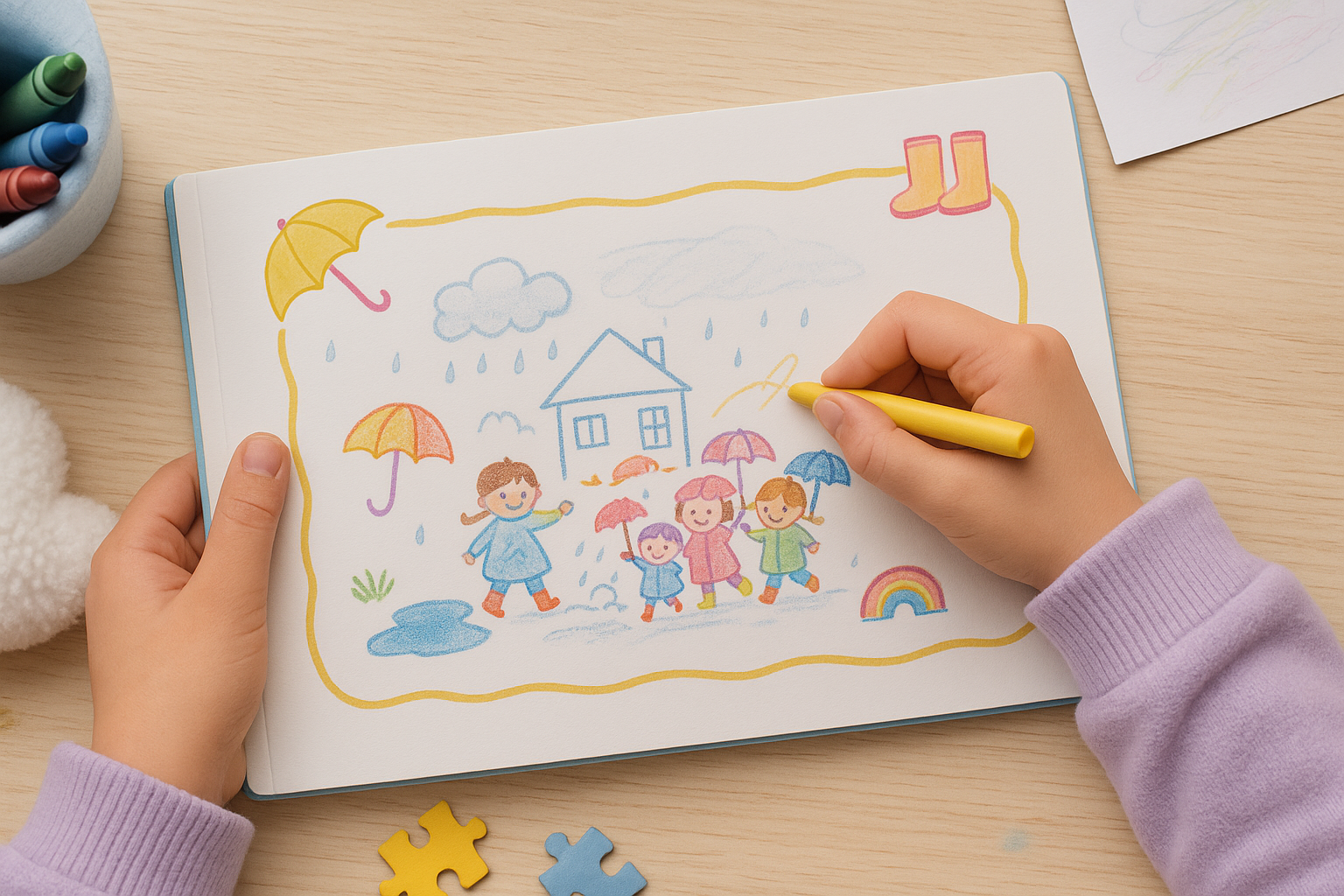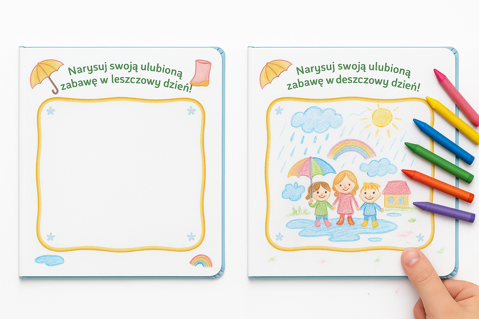 Zabierz swoje dziecko w kolorową podróż po przedszkolu, gdzie nawet deszczowy dzień może być pełen radości i zabawy! 🌦️