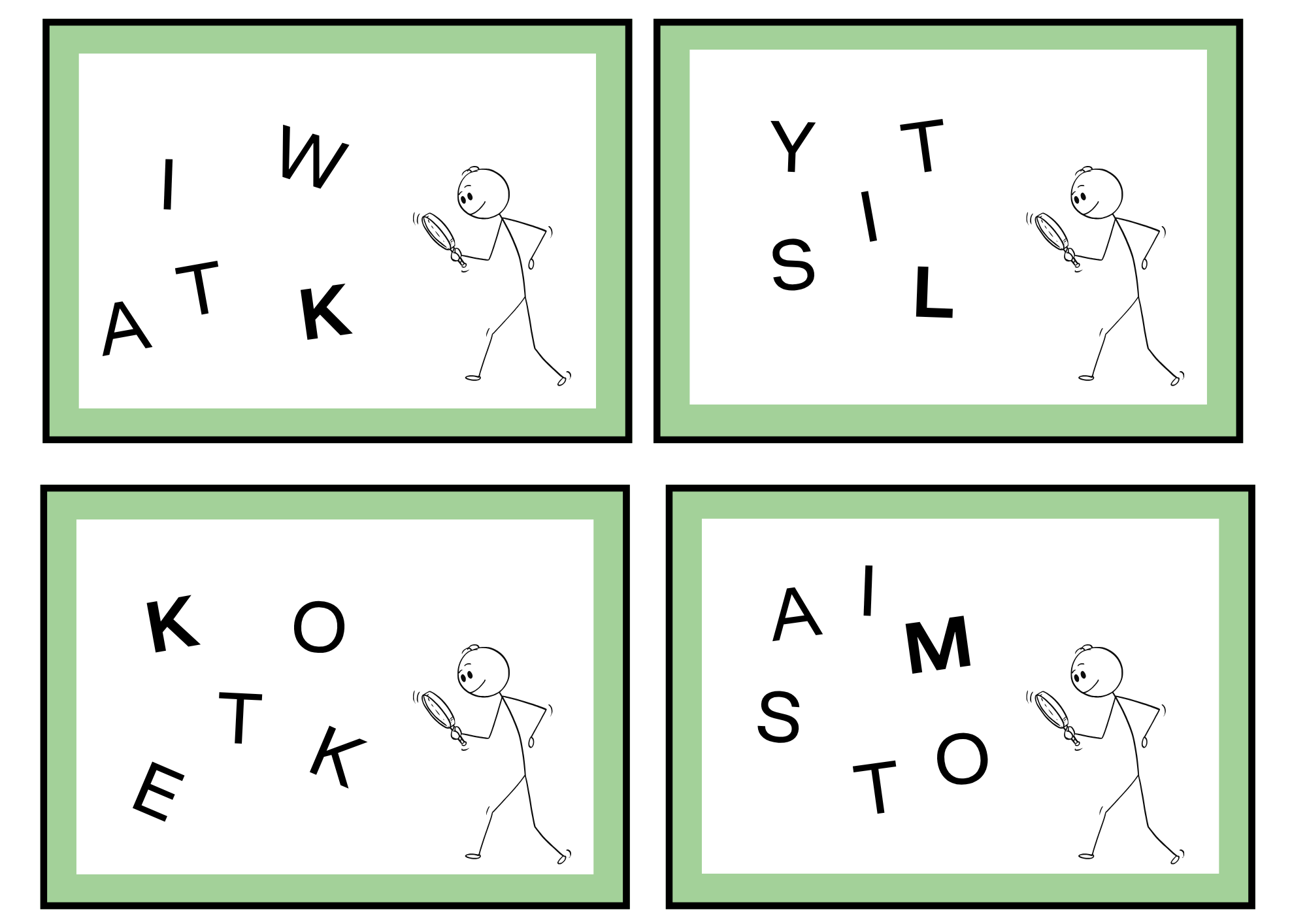 Każde zadanie to rozsypanka liter, z której należy ułożyć słowo, zaczynając od pogrubionej litery.