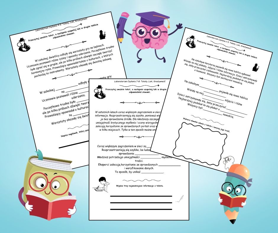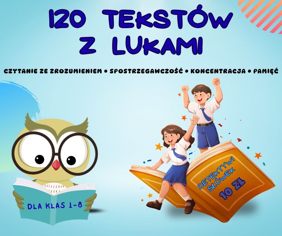 Pakiet 120 Tekstów z Lukami dla klas 1–3, 4–6 i 7–8 to kompletne narzędzie do ćwiczenia czytania ze zrozumieniem, spostrzegawczości, koncentracji i pamięci.